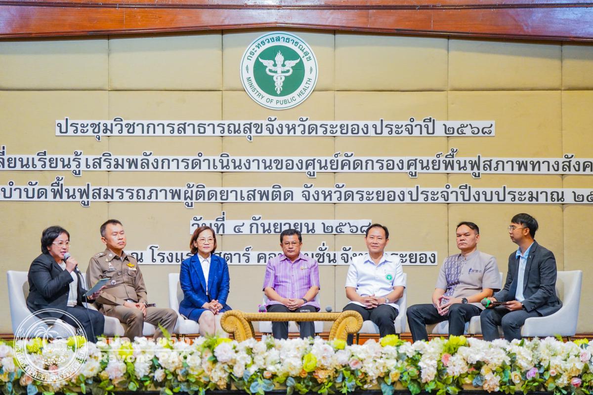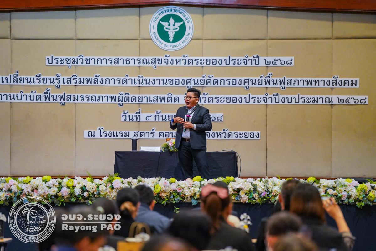 วันที่ 4 กันยายน 2568 เวลา 10.00 น. แพทย์หญิงสมบัติ ชุติมานุกูล เลขานุการนายกองค์การบริหารส่วนจังหวัดระยอง ร่วมเป็นวิทยากรเสวนาในประเด็น “บทบาท หน้าที่ และแนวทางการสนับสนุนด้านการป้องกันและแก้ไขปัญหายาเสพติดขององค์การบริหารส่วนจังหวัดระยอง“ บนเวทีเสวนา “แลกเปลี่ยนเรียนรู้ เสริมพลังการดำเนินงานด้านยาเสพติด“ เพื่อเป็นการแลกเปลี่ยนผลการดำเนินงานด้านบำบัดรักษาผู้ติดยาเสพติด และเพื่อบูรณาการการแก้ไขปัญหายาเสพติด ร่วมกับหน่วยงานและภาคีเครือข่ายที่เกี่ยวข้อง ในการขับเคลื่อนการดำเนินงานตามนโยบายด้านยาเสพติดเร่งด่วน ภายใต้นโยบาย " Rayong Model " และนโยบายการขับเคลื่อนงานด้านยาเสพติดของจังหวัดระยอง ณ ห้องประชุมสุนทรภู่ โรงแรมสตาร์ คอนเวนชั่น อำเภอเมืองระยอง จังหวัดระยอง