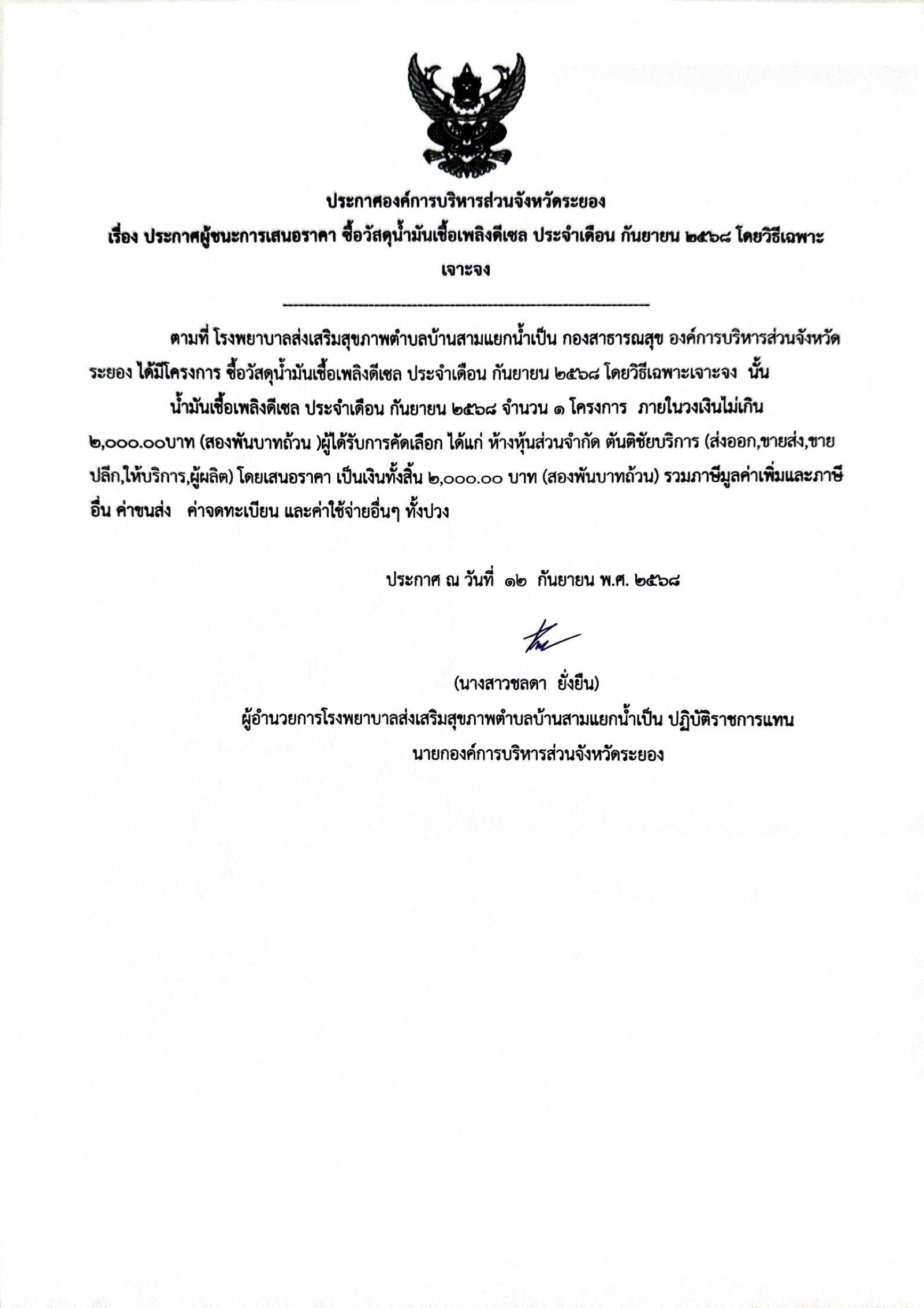ประกาศผู้ชนะการเสนอราคา ซื้อวัสดุน้ำมันเชื้อเพลิงดีเซล ประจำเดือน กันยายน 2568 โดยวิธีเฉพาะเจาะจง