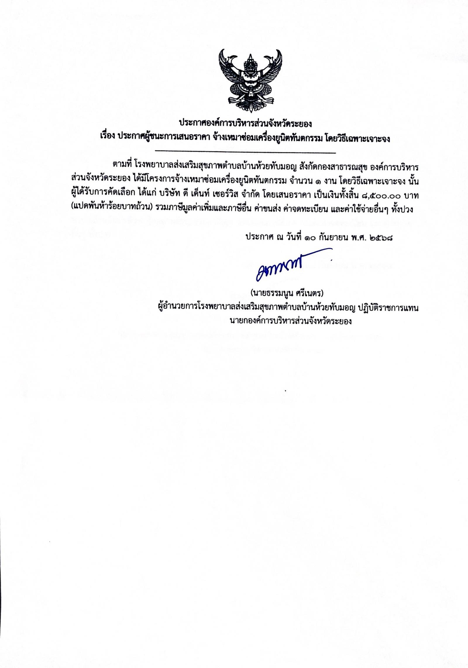 ประกาศผู้ชนะการเสนอราคา จ้างเหมาซ่อมเครื่องยูนิตทันตกรรม โดยวิธีเฉพาะเจาะจง