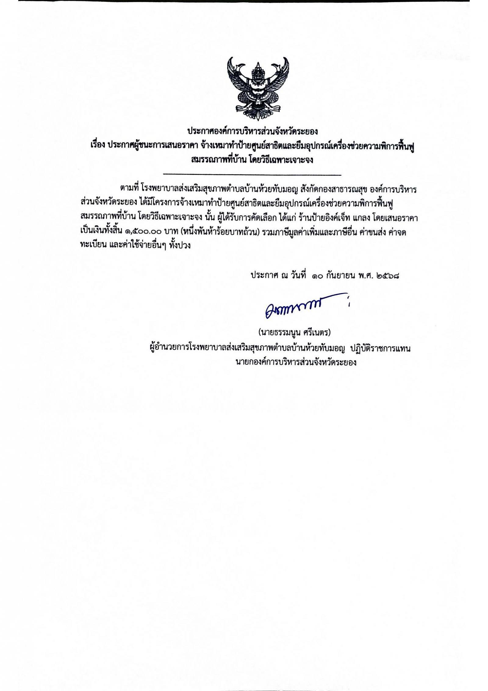 ประกาศผู้ชนะการเสนอราคา จ้างเหมาทำป้ายศูนย์สาธิตและยืมอุปกรณ์เครื่องช่วยความพิการฟื้นฟูสมรรณภาพที่บ้าน โดยวิธีเฉพาะเจาะจง