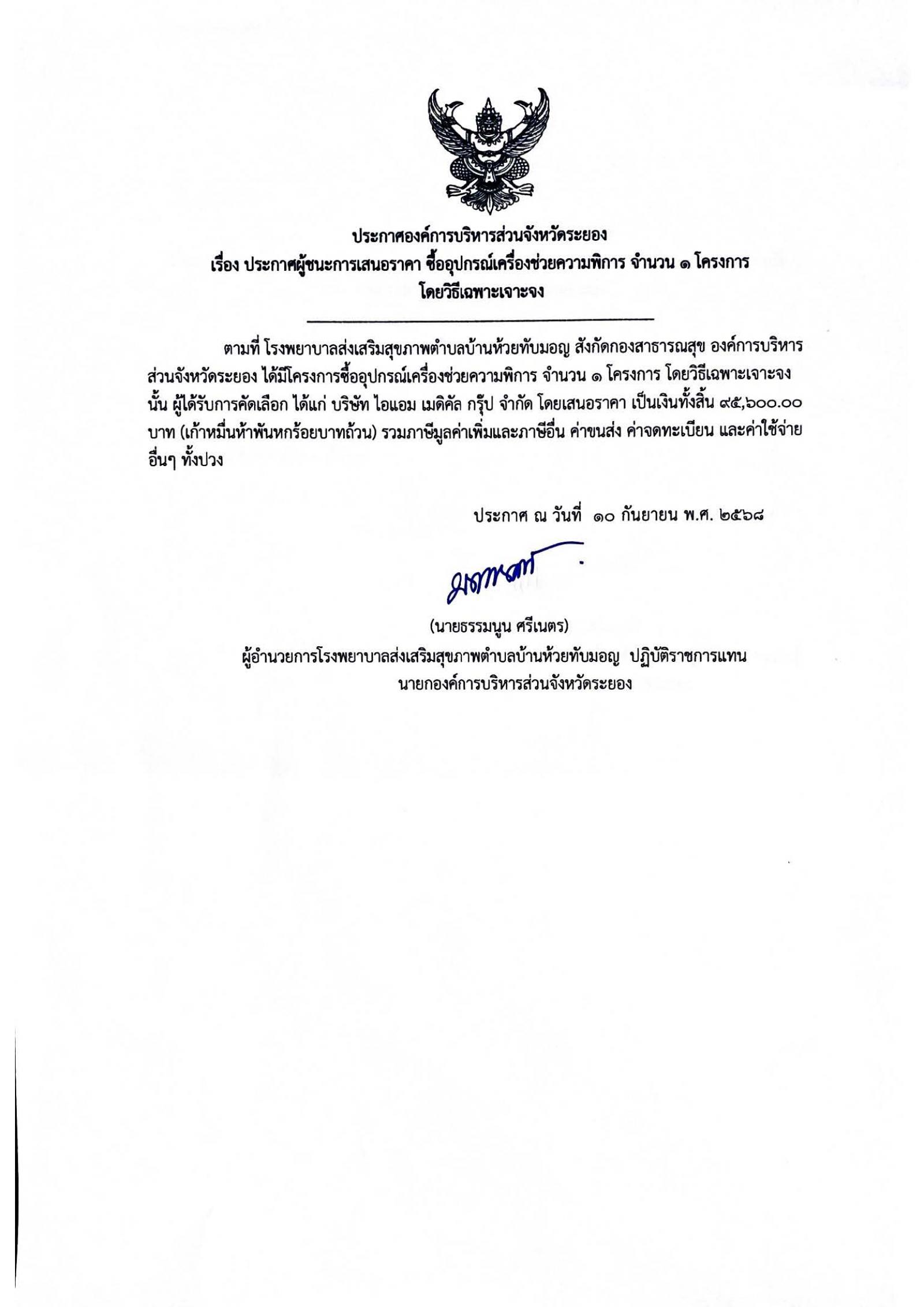 📌ประกาศผู้ชนะการเสนอราีคา จ้างเหมาจัดทำทำเนียบองค์การบริหารส่วนจัหวัดระยอง