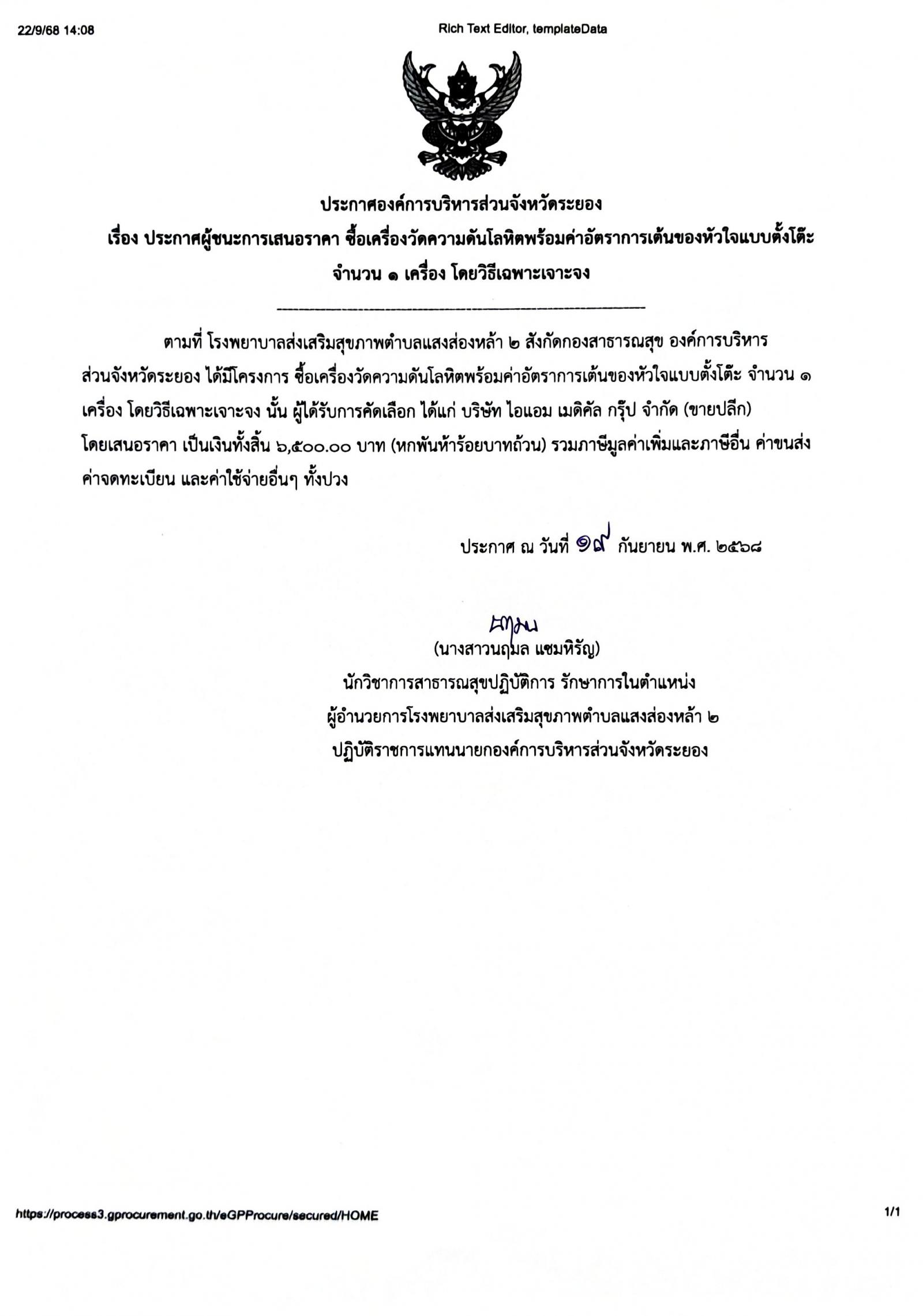 ประกาศผู้ชนะการเสนอราคา ซื้อเครื่องวัดความดัดโลหิตพร้อมค่าอัตราการเต้นของหัวใจแบบตั้งโต๊ะ จำนวน 1 เครื่อง โดยวิธีเฉพาะเจาะจง