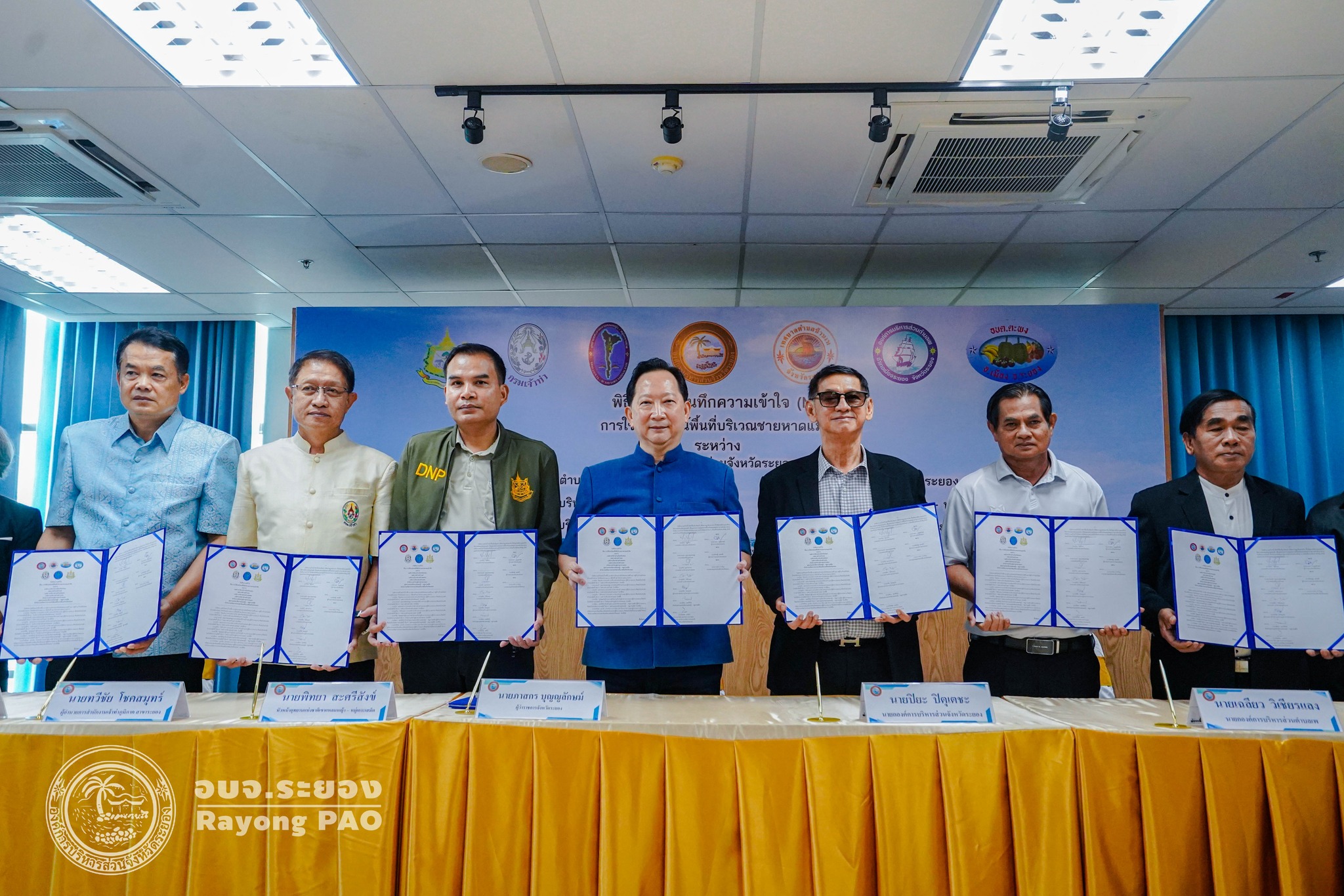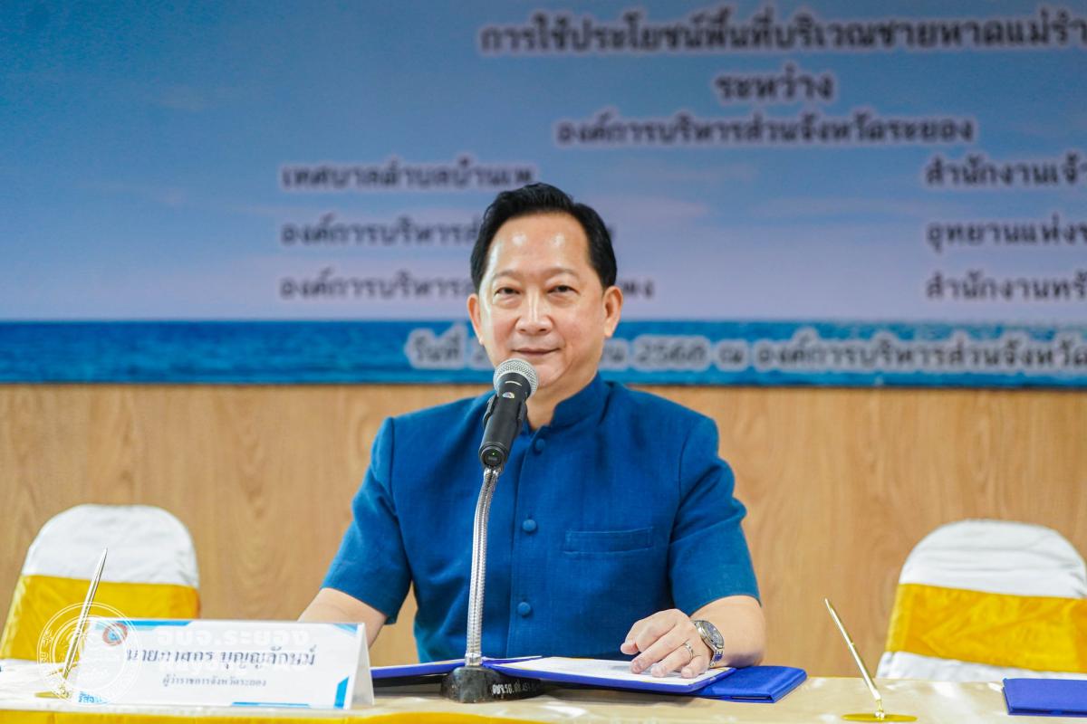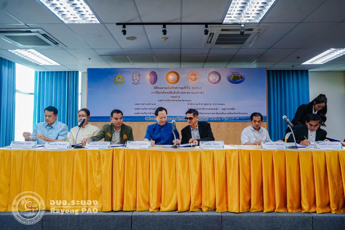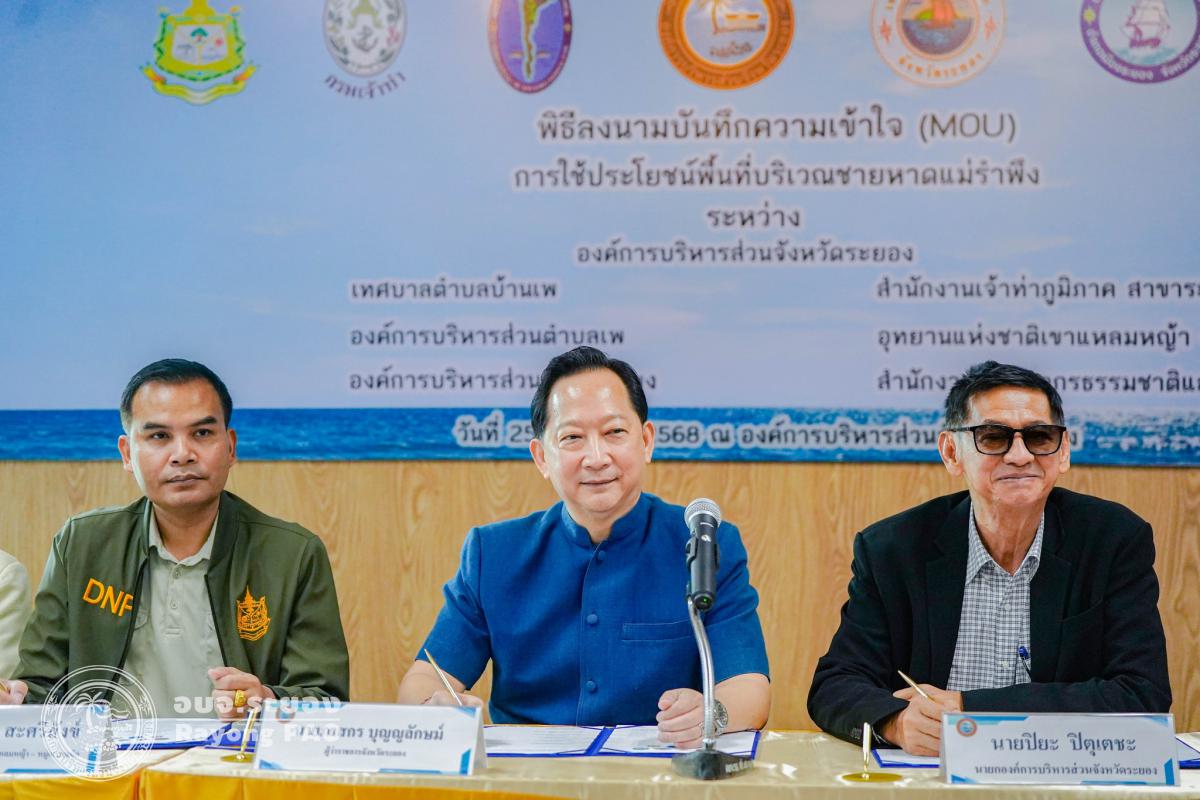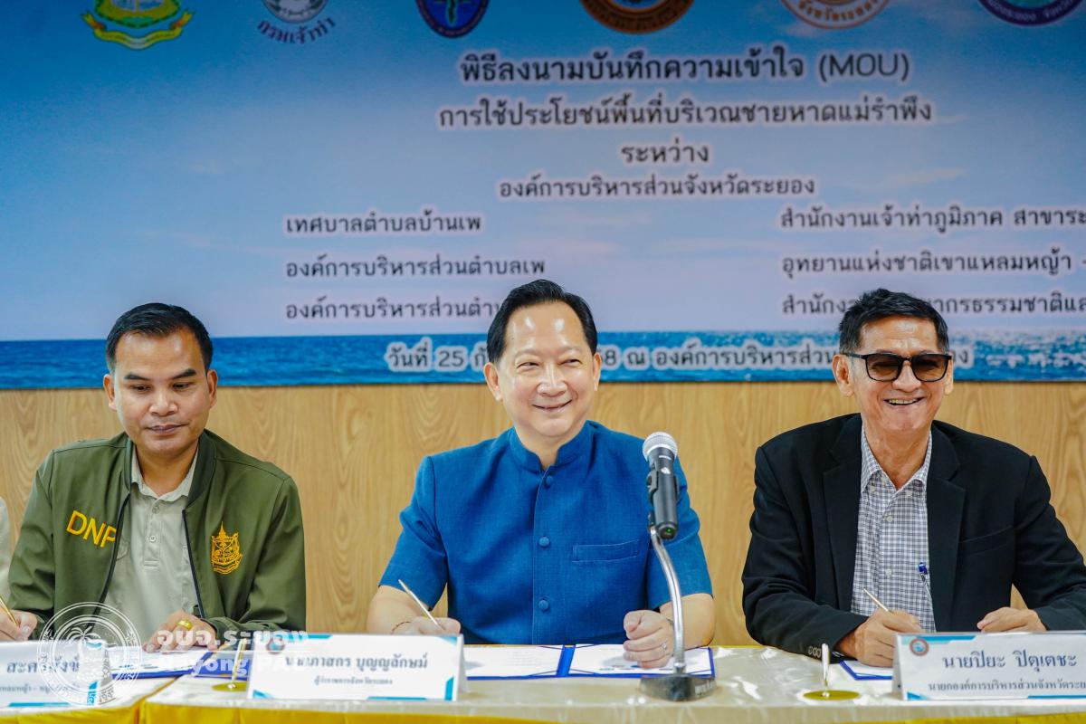 วันที่ 25 กันยายน 2568 เวลา 10.00 น. ณ ห้องประชุมองค์การบริหารส่วนจังหวัดระยอง นายปิยะ ปิตุเตชะ นายกองค์การบริหารส่วนจังหวัดระยอง พร้อมด้วย คณะผู้บริหาร หัวหน้าส่วนราชการ ผู้แทนองค์กรปกครองส่วนท้องถิ่น และผู้ที่เกี่ยวข้องเข้าร่วมพิธีลงนามบันทึกข้อตกลงความเข้าใจ (MOU) เรื่อง การใช้ประโยชน์พื้นที่บริเวณชายหาดแม่รำพึง โดยมี นายภาสกร บุญญลักษม์ ผู้ว่าราชการจังหวัดระยอง เป็นประธานในพิธีฯ ร่วมลงนามเป็นสักขีพยาน พร้อมด้วย 7 หน่วยงาน ประกอบด้วย องค์การบริหารส่วนจังหวัดระยอง, เทศบาลตำบลบ้านเพ, องค์การบริหารส่วนตำบลตะพง, องค์การบริหารส่วนตำบลเพ, สำนักงานเจ้าท่าภูมิภาค สาขาระยอง, อุทยานแห่งชาติเขาแหลมหญ้า - หมู่เกาะเสม็ด และสำนักงานทรัพยากรธรรมชาติและสิ่งแวดล้อม