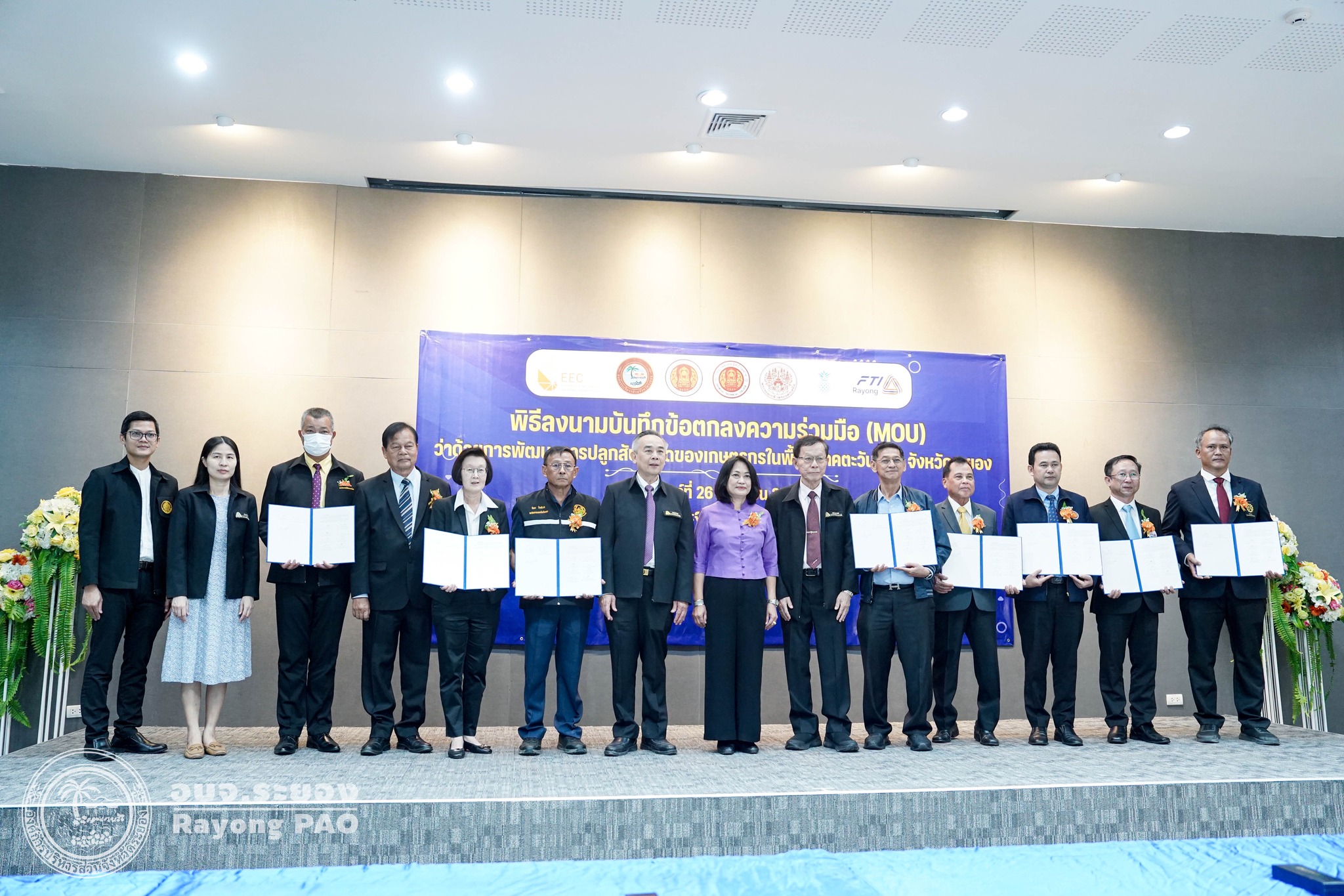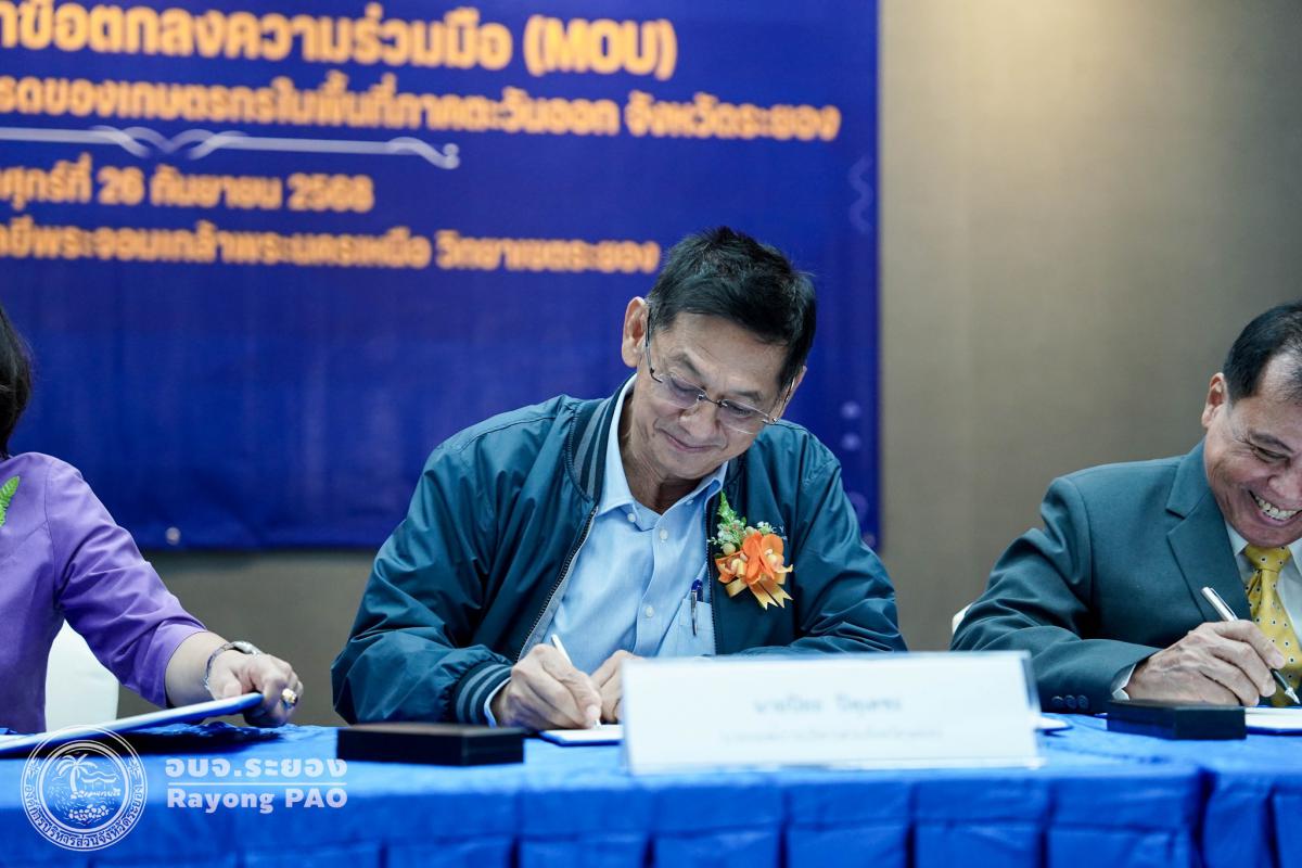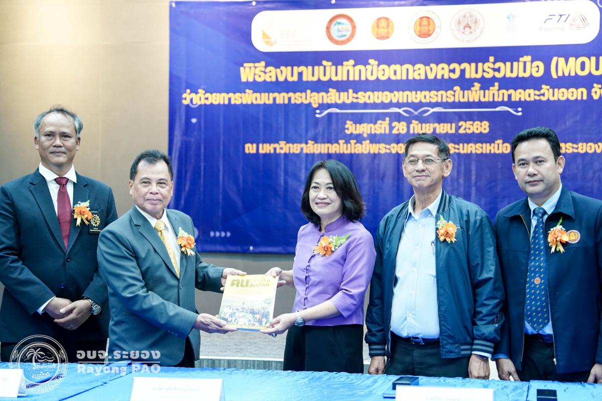 วันที่ 26 กันยายน 2568 เวลา 14.00 น. นายปิยะ ปิตุเตชะ นายกองค์การบริหารส่วนจังหวัดระยอง พร้อมด้วย นายเสนาะ รอดระหงษ์ ประธานสมาคมพัฒนาสับปะรดไทยภาคตะวันออก , นายจิระพงษ์ จันทร์ประเสริฐ รองผู้อำนวยการสถาบันการอาชีวศึกษาภาคตะวันออก และผู้แทนมหาวิทยาลัยเทคโนโลยีพระจอมเกล้าพระนครเหนือ วิทยาเขตจังหวัดระยอง เข้าร่วมพิธีลงนามบันทึกข้อตกลงความร่วมมือ (MOU) ว่าด้วยการพัฒนาการปลูกสับปะรดของเกษตรกร ในพื้นที่ภาคตะวันออก โดยมี นางสาวสลารีวรรณ ทัพทวี รองผู้ว่าราชการจังหวัดระยอง เป็นประธานในพิธีฯ ร่วมลงนามเป็นสักขีพยาน ร่วมกับสมาคมพัฒนาสับปะรดไทยภาคตะวันออก มหาวิทยาลัยเทคโนโลยีพระจอมเกล้าพระนครเหนือ วิทยาเขตระยอง วิทยาลัยเทคนิคบ้านค่าย สำนักงานคณะกรรมการนโยบายเขตพัฒนาพิเศษภาคตะวันออก (สกพอ.) องค์การบริหารส่วนจังหวัดระยอง สภาอุตสาหกรรมจังหวัดระยอง และวิสาหกิจชุมชนแปลงใหญ่จังหวัดระยอง โดยมีวัตถุประสงค์เพื่อพัฒนาเครื่องมือ เครื่องจักร และอุปกรณ์ในการอำนวยความสะดวก และเพิ่มประสิทธิภาพในการปลูกสับปะรดให้แก่เกษตรกรโดยเฉพาะพื้นที่ภาคตะวันออกมีพื้นที่นำร่องคือจังหวัดระยอง