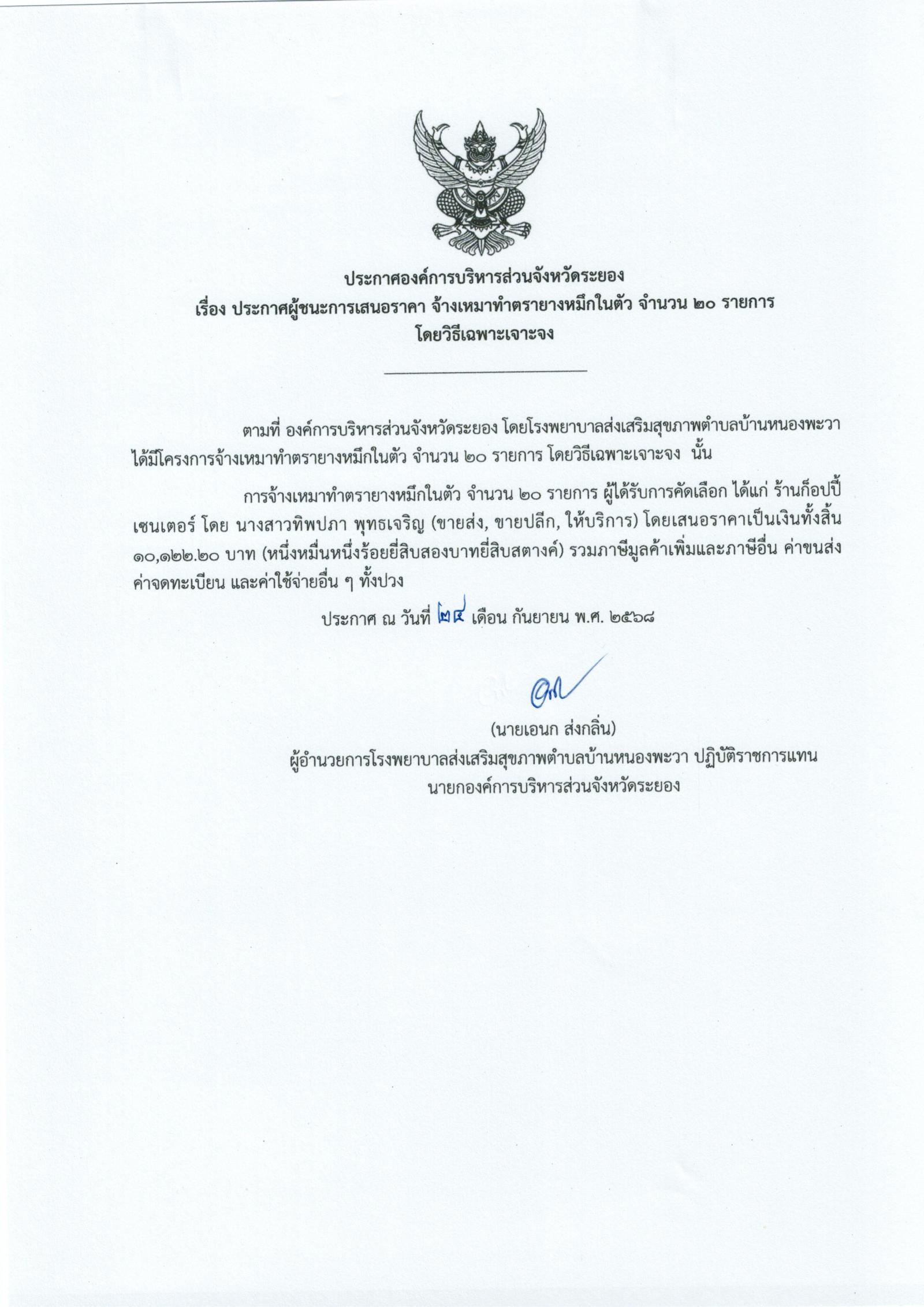 📌ประกาศผู้ชนะการเสนอราีคา จ้างเหมาจัดทำทำเนียบองค์การบริหารส่วนจัหวัดระยอง