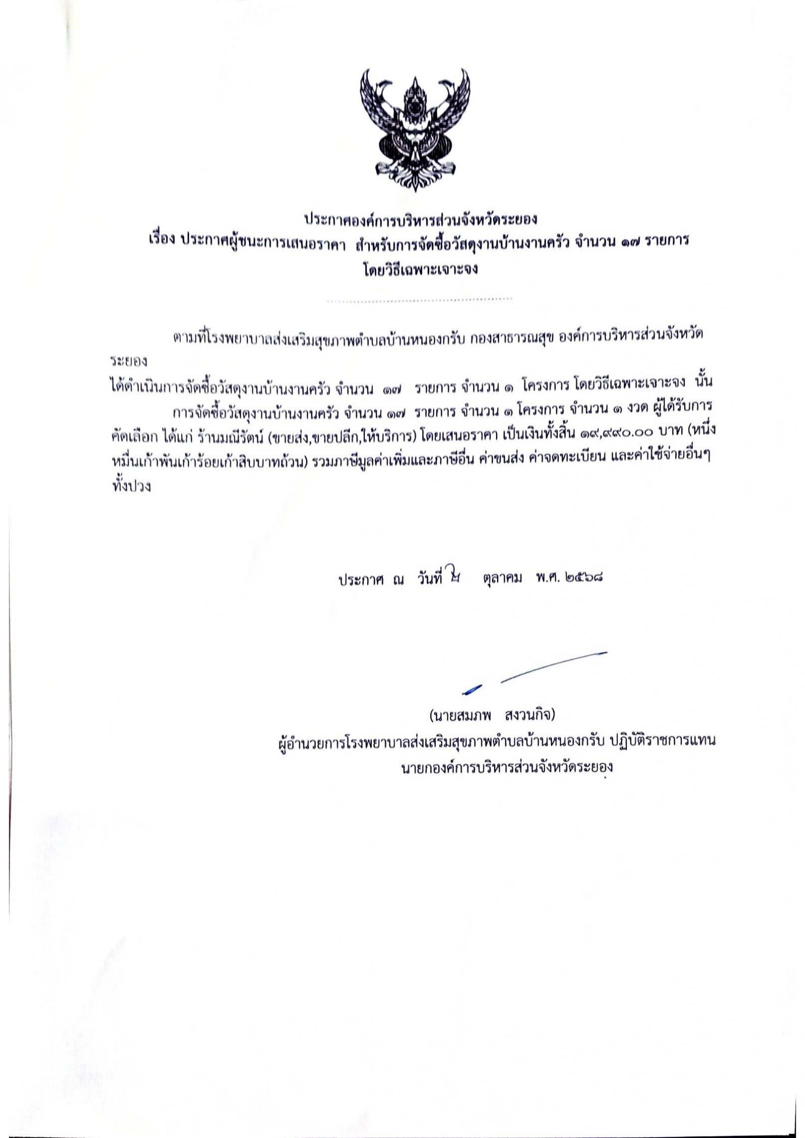 📌ประกาศผู้ชนะการเสนอราีคา จ้างเหมาจัดทำทำเนียบองค์การบริหารส่วนจัหวัดระยอง