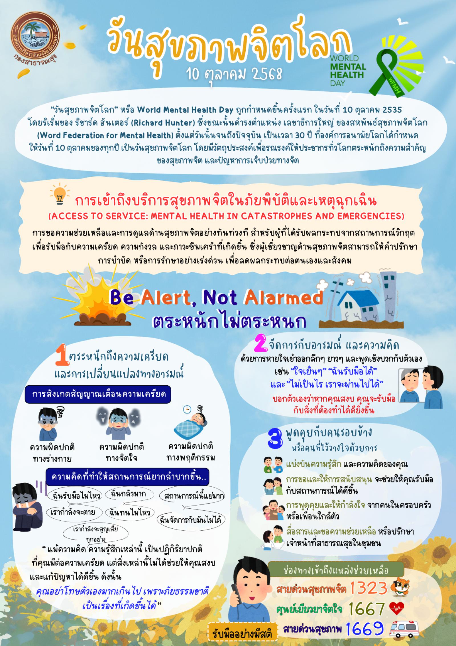 ด้วยกองสาธารณสุข ได้จัดทำสื่อประชาสัมพันธ์วันสุขภาพจิตโลก ประจำปี พ.ศ. ๒๕๖๘ (World Mental Health Day ๒๐๒๕) เพื่อประชาสัมพันธ์ให้บุคลากรในสังกัดองค์การบริหารส่วนจังหวัดระยอง และประชาชนทั่วไป ได้ตระหนักถึงความสำคัญของวันสุขภาพจิตโลก และการเข้าถึงบริการสุขภาพจิตในภัยพิบัติและเหตุฉุกเฉิน การขอความช่วยเหลือและการดูแลด้านสุขภาพจิตอย่างทันท่วงที สำหรับผู้ที่ได้รับผลกระทบจากสถานการณ์วิกฤต เพื่อรับมือกับความเครียด ความกังวล และภาวะซึมเศร้าที่เกิดขึ้น ซึ่งผู้เชี่ยวชาญด้านสุขภาพจิตสามารถให้คำปรึกษา บำบัด หรือรักษาอย่างเร่งด่วน เพื่อลดผลกระทบต่อตนเองและสังคม รายละเอียดตามเอกสารที่แนบมาพร้อมนี้