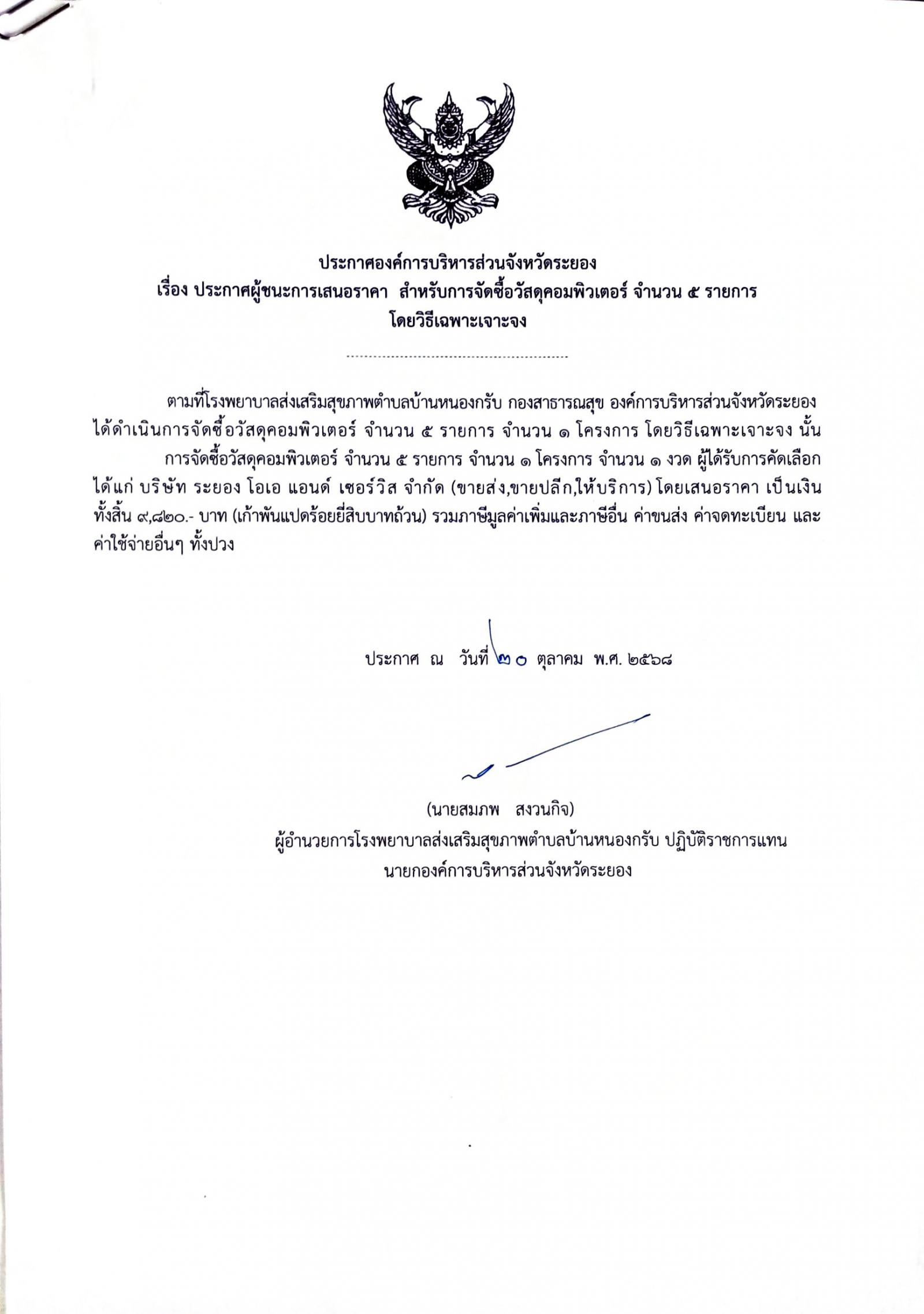 📌ประกาศผู้ชนะการเสนอราีคา จ้างเหมาจัดทำทำเนียบองค์การบริหารส่วนจัหวัดระยอง
