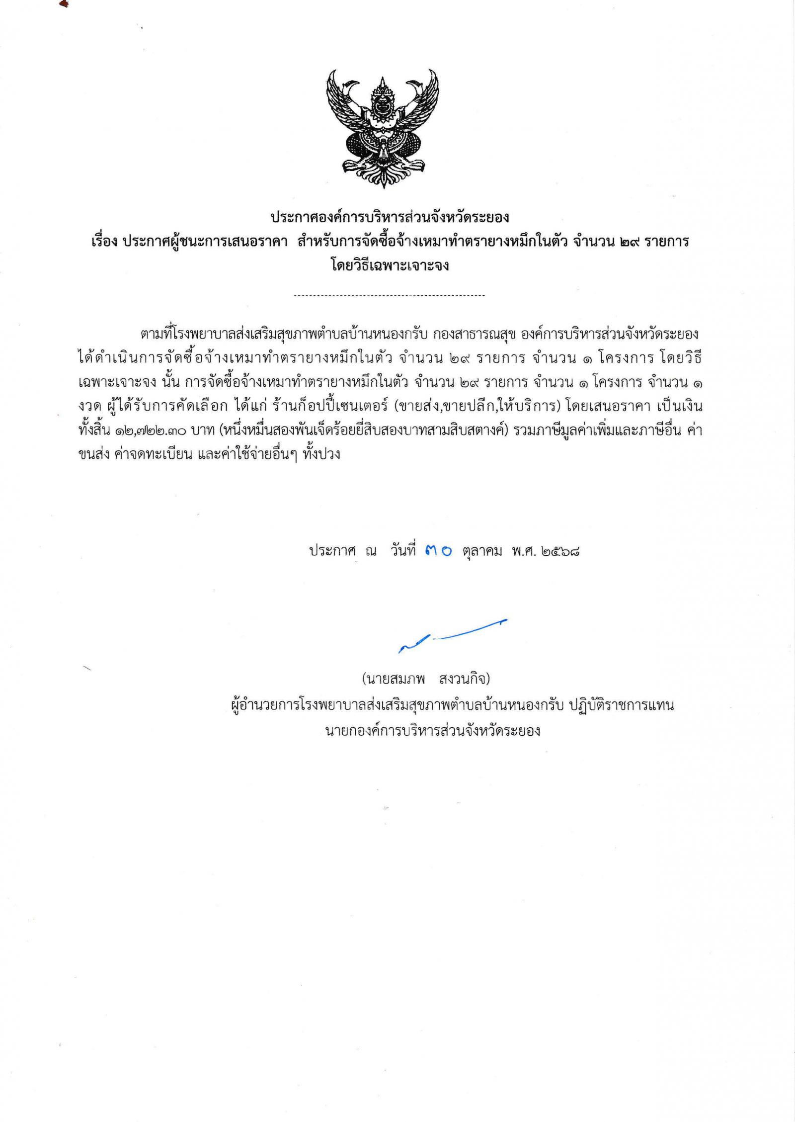 ประกาศผู้ชนะการเสนอราคา สำหรับการจัดซื้อจ้างเหมาทำตรายางหมึกในตัว จำนวน 29 รายการ โดยวิธีเฉพาะเจาะจง