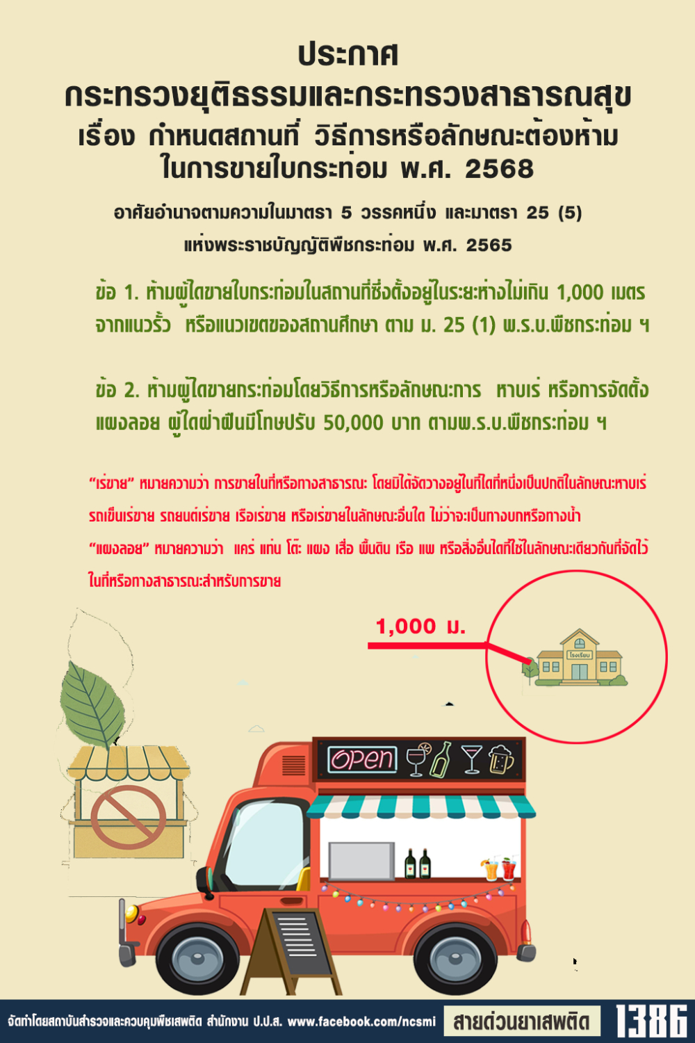 ประกาศกระทรวงยุติธรรมและกระทรวงสาธารณสุข เรื่อง กำหนดสถานที่ วิธีการ หรือลักษณะต้องห้าม ในการขายใบกระท่อม พ.ศ. ๒๕๖๘