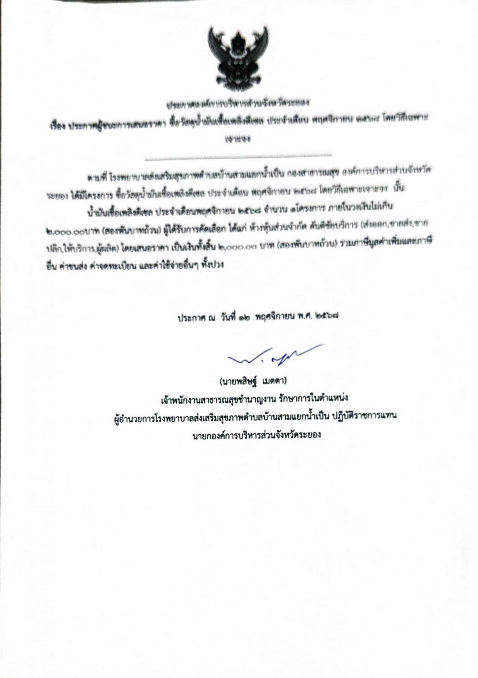 ประกาศผู้ชนะการเสนอราคา ซื้อวัสดุน้ำมันเชื้อเพลิงดีเซล ประจำเดือน พฤศจิกายน 2568 โดยวิธีเฉพาะเจาะจง