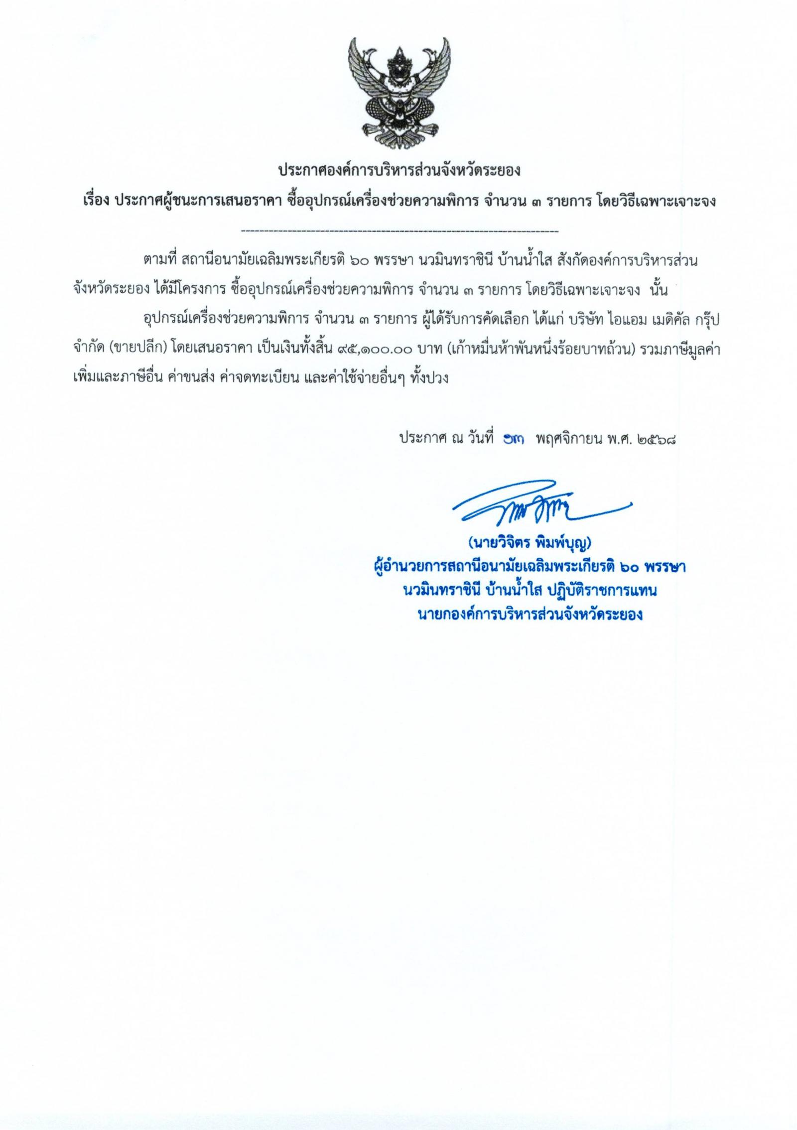 ประกาศผู้ชนะการเสนอราคา ซื้ออุปกรณ์เครื่องช่วยความพิการ จำนวน 3 รายการ โดยวิธีเฉพาะเจาะจง