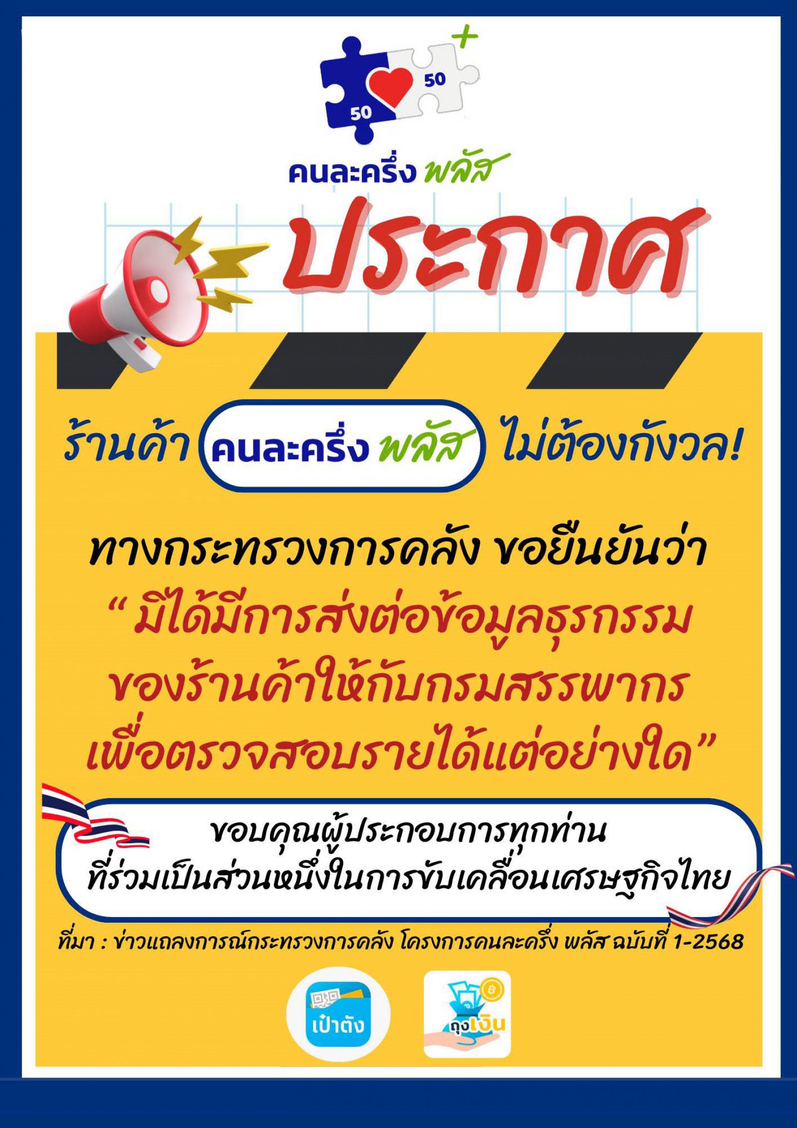 ด้วยจังหวัดระยองแจ้งว่า กระทรวงมหาดไทยขอให้องค์กรปกครองส่วนท้องถิ่น ดำเนินการประชาสัมพันธ์และทำความเข้าใจกับร้านค้าที่เข้าร่วมโครงการคนละครึ่ง พลัส ว่าสำหรับร้านค้าที่เข้าร่วมโครงการฯ กระทรวงการคลัง โดยสำนักงานเศรษฐกิจการคลัง มิได้มีการส่งต่อข้อมูลธุรกรรมให้กับกรมสรรพากรเพื่อตรวจสอบรายได้แต่อย่างใด