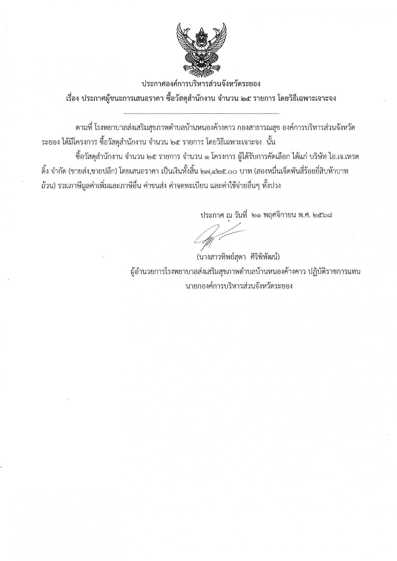 ประกาศผู้ชนะการเสนอราคา ซื้อวัสดุสำนักงาน จำนวน 25 รายการ โดยวิธีเฉพาะเจาะจง