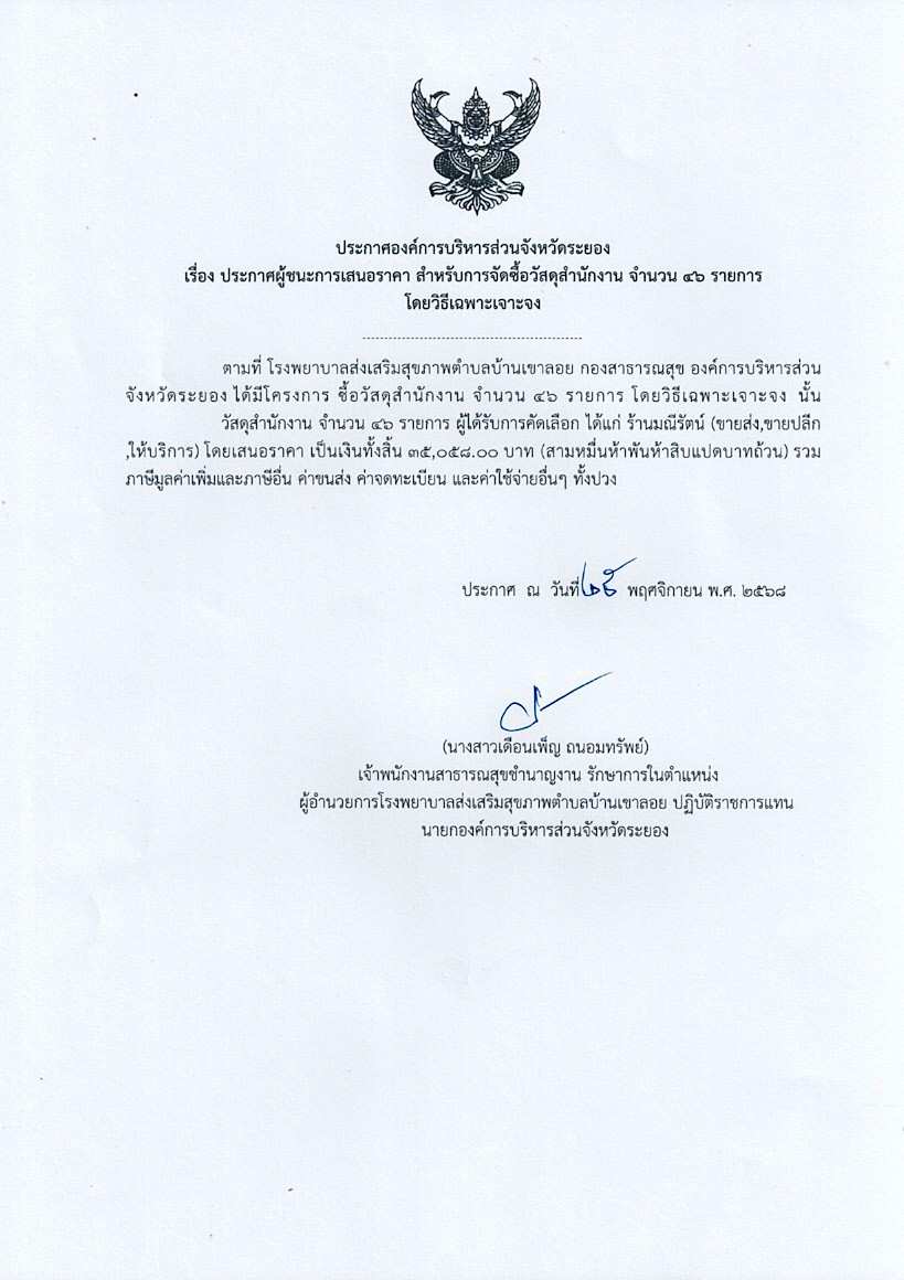 ประกาศผู้ชนะการเสนอราคา สำหรับการจัดซื้อวัสดุสำนักงาน จำนวน 46 รายการ โดยวิธีเฉพาะเจาะจง