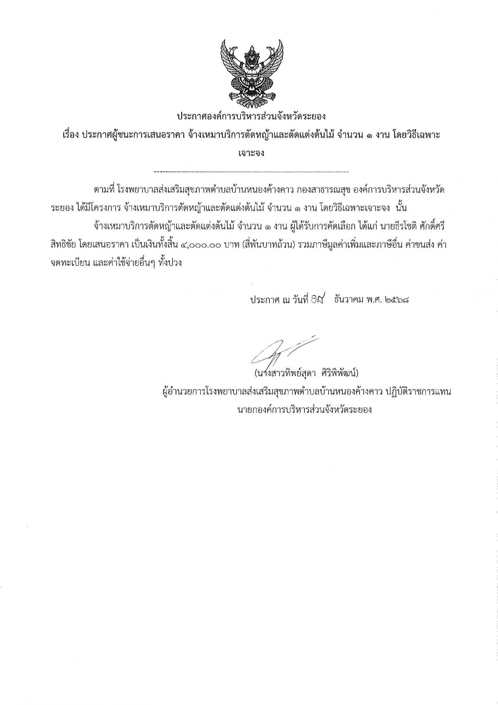 ประกาศผู้ชนะการเสนอราคา จ้างเหมาบริการตัดหญ้าและตัดแต่งต้นไม้ จำนวน 1 งาน โดยวิธีเฉพาะเจาะจง