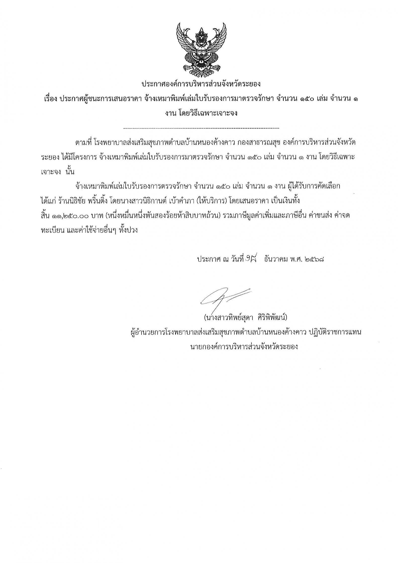 ประกาศผู้ชนะการเสนอราคา จ้างเหมาพิมพ์เล่มใบรับรองการมาตรวจรักษา จำนวน 150 เล่ม จำนวน 1 งาน โดยวิธีเฉพาะเจาะจง