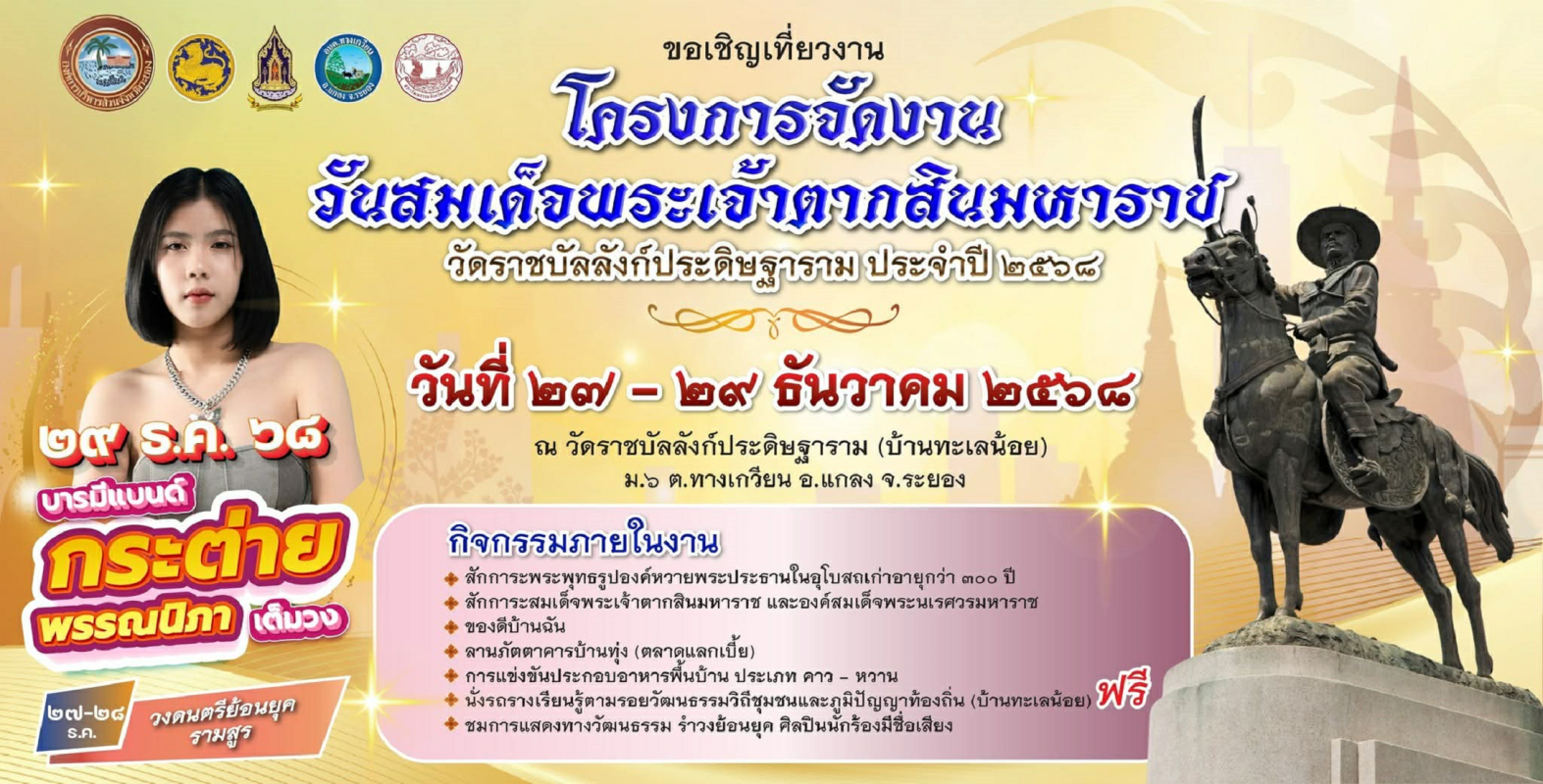 อบจ.ระยอง ขอเชิญเที่ยวงาน “วันสมเด็จพระเจ้าตากสินมหาราช วัดราชบัลลังก์ประดิษฐาราม” ประจำปี ๒๕๖๘ ระหว่างวันที่ ๒๗ – ๒๙ ธันวาคม ๒๕๖๘ ณ วัดราชบัลลังก์ประดิษฐาราม (วัดบ้านทะเลน้อย) อ.แกลง จ.ระยอง