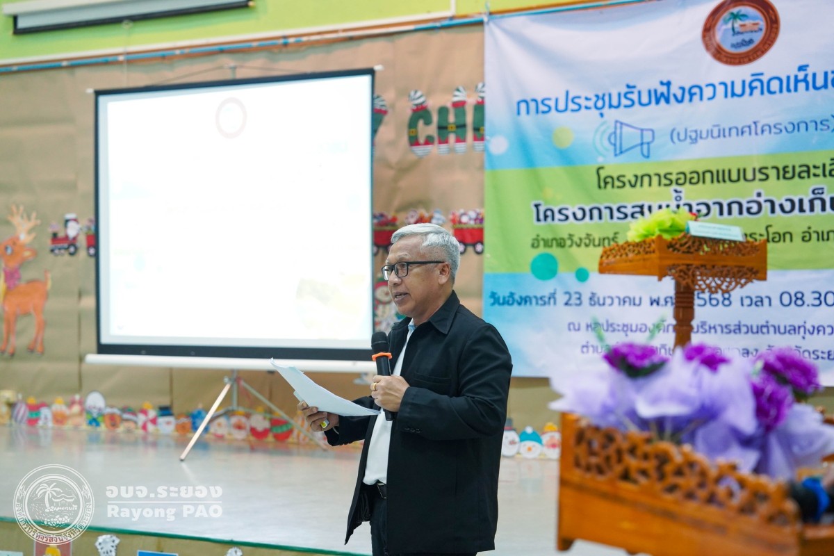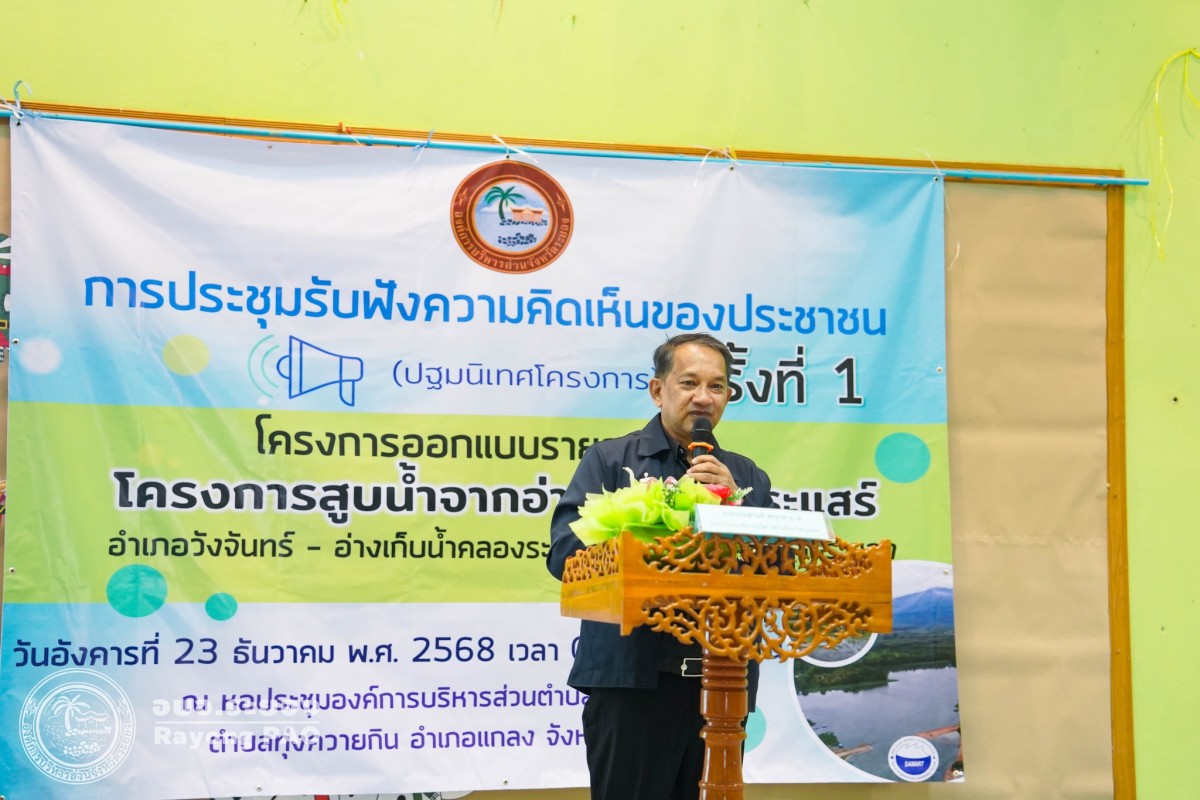 โดยการประชุมรับฟังความคิดเห็น โครงการออกแบบรายละเอียด โครงการสูบน้ำจากอ่างเก็บน้ำประแสร์ อำเภอวังจันทร์ - อ่างเก็บน้ำคลองระโอก อำเภอแกลง ครั้งที่ 1 (ปฐมนิเทศโครงการ) ตามขอบเขตของงานจ้างออกแบบ (TOR) ของโครงการดังกล่าวในข้อ 4 (9) จัดให้มีการประชุมชี้แจงและประชาสัมพันธ์โครงการต่อหน่วยงานภาครัฐ อปท. องค์กรภาคเอกชน ผู้นำชุมชนและผู้แทนภาคประชาชนที่เกี่ยวข้องจำนวน 2 ครั้ง ครั้งละไม่น้อยกว่า 80 คน ครั้งที่ 1 เพื่อแนะนำโครงการและนำเสนอขอบเขตของการออกแบบขั้นตอนการดำเนินโครงการ แนวทางในการแก้ไขปัญหาน้ำท่วมและการบริหารจัดการน้ำของพื้นที่ดำเนินการลักษณะโครงการที่ถูกคัดเลือกมาดำเนินการออกแบบรายละเอียด เพื่อให้การออกแบบโครงการดังกล่าว ดำเนินการถูกต้องตรงตามวัตถุประสงค์ของโครงการ และเกิดประโยชน์สูงสุดต่อประชาชนในพื้นที่