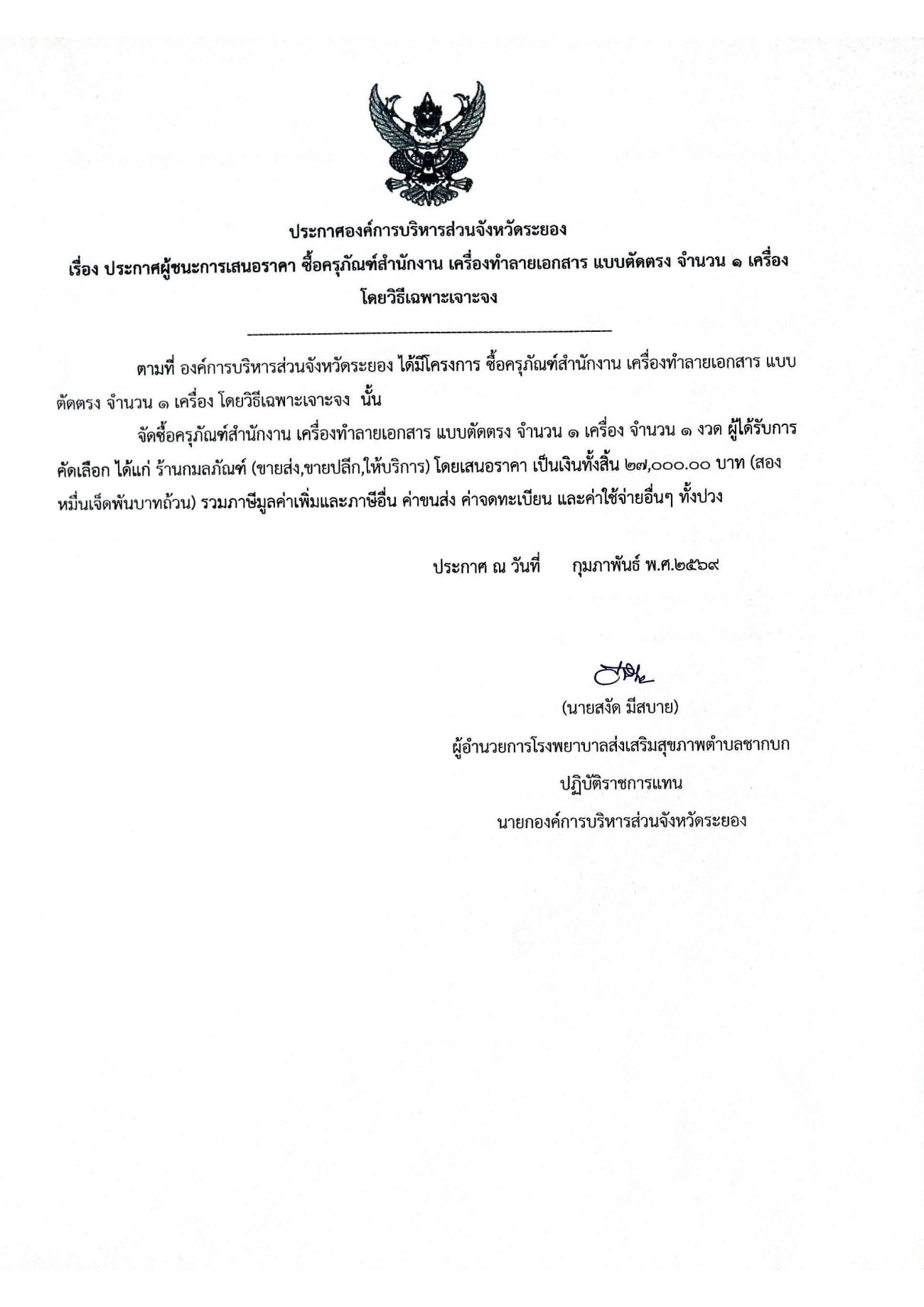 ประกาศผู้ชนะการเสนอราคา ซื้อครุภัณฑ์สำนักงาน เครื่องทำลอยเอกสาร แบบตัดตรง จำนวน 1 เครื่อง