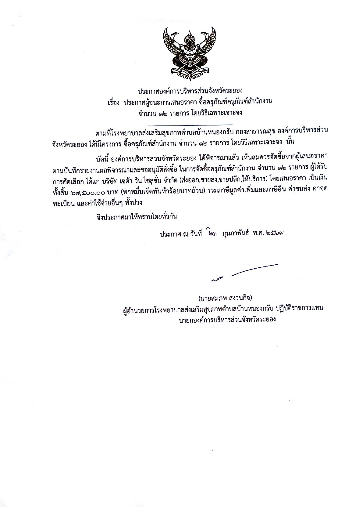 ประกาศผู้ชนะเสนอราคา ซื้อครุภัณฑ์สำนักงาน จำนวน 12 รายการ โดยวิธีเฉพาะเจาะจง