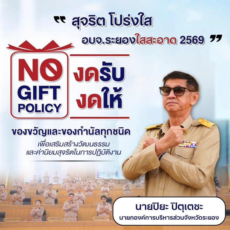 อบจ.ระยอง ประกาศเจตนารมณ์ เรื่อง “สุจริต โปร่งใส องค์การบริหารส่วนจังหวัดระยองใสสะอาด 2569” และ “งดรับ งดให้” ของขวัญ ของกำนัลทุกชนิดจากการปฏิบัติหน้าที่ (No Gift Policy)