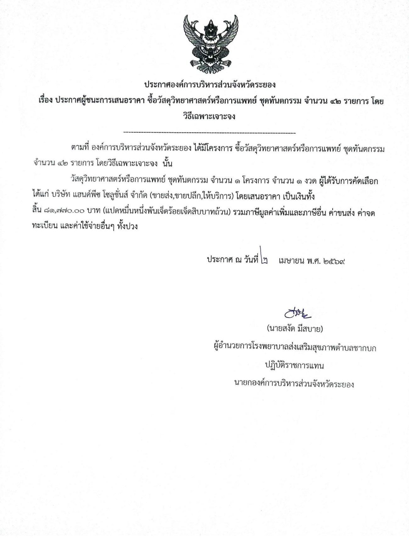 ประกาศผู้ชนะการเสนอราคา ซื้อวัสดุวิทยาศาสตร์หรือการแพทย์ ชุดทันตกรรม จำนวน 42 รายการ โดยวิธีเฉพาะเจาะจง