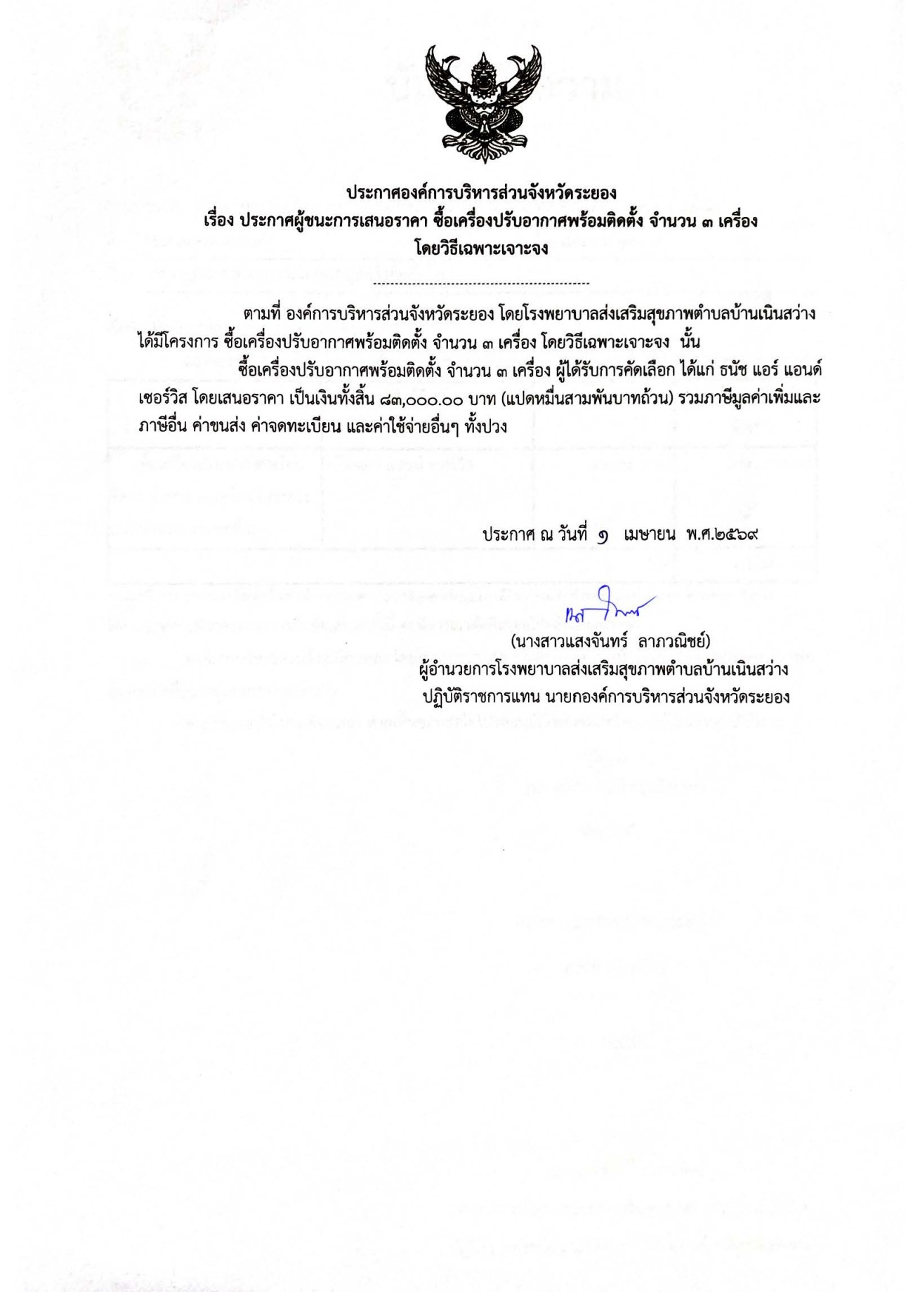 ประกาศผู้ชนะการเสนอราคา ซื้อเครื่องปรับอากาศพร้อมติดตั้ง จำนวน 3 เครื่อง โดยวิธีเฉพาะเจาะจง