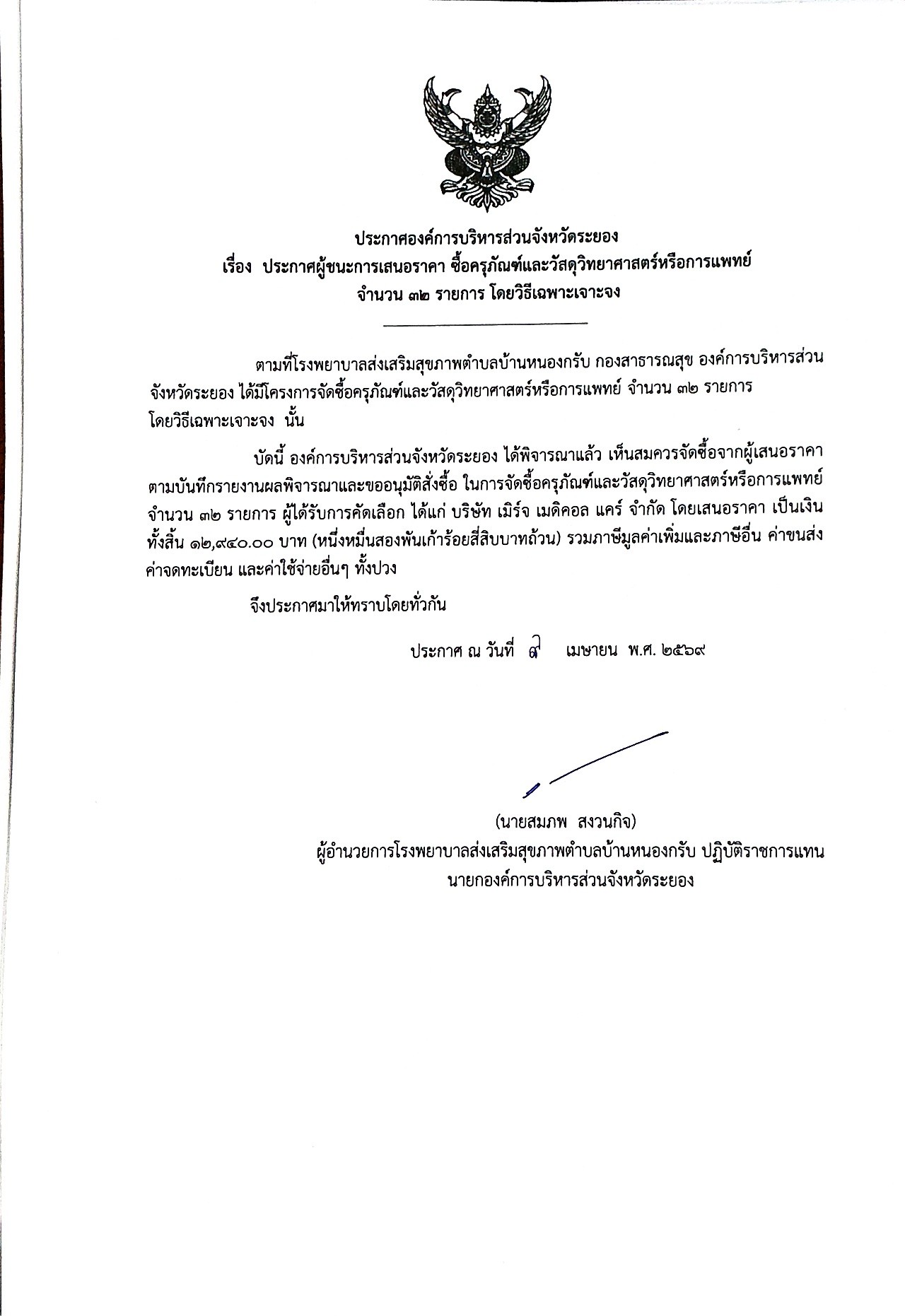 ประกาศผู้ชนะการเสนอราคา ซื้อครุภัณฑ์และวัสดุวิทยาศาสตร์หรือการแพทย์ จำนวน 32 รายการ โดยวิธีเฉพาะเจาะจง