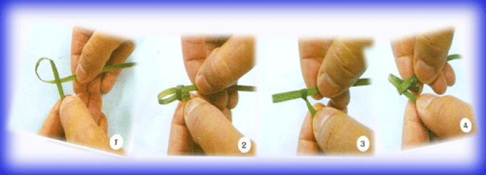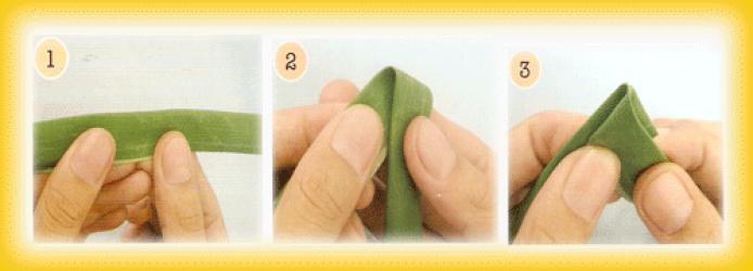 ๑. ฉีกใบตองกว้าง ๑/๒ เซ็น้ติเมตร แล้วม้วนโดยเส้นทางขวามือซ้อนทับบนเส้นทางซ้ายมือ