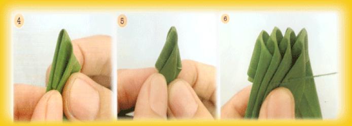 2. พับเป็นกลีบกุหลาบตามรูป จำนวน 3 กลีบ จากนั้นนำมาสวมเรียงกันให้มีระยะห่างพองามตามความชอบ ควรจัดให้ยอดของกลีบ และลอนของกลีบตรงเสมอเป็นแนวเดียว ซึ่งจะทำให้ผลงานออกมาดูสวยงามเป็นระเบียบเรียบร้อย