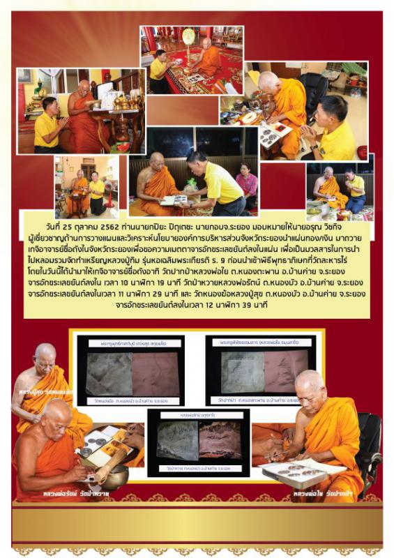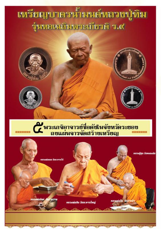 วันพฤหัสบดีที่ 14 พฤศจิกายน 2562 เวลา 15.59 นาฬิกามูลนิธิสถาบันพระมหาชนก องค์การบริหารส่วนจังหวัดระยอง เปิดจองเหรียญบาตรน้ำมนต์หลวงปู่ทิม รุ่นหอเฉลิมพระเกียรติ ร. 9 เป็นวันแรก ปรากฎว่า มีผู้ใจบุญ ร่วมจองเหรียญและจ่ายเงินเต็มจำนวนแล้ว จำนวน 3 ราย ขอบุญกุศลในการร่วมบุญครั้งนี้ จงดลบันดาลประทานพรให้ท่านและครอบครัว เจริญด้วยอายุ วรรณะ สุขะ พละ และลาภยศ สรรเสริญ ด้วยเทอญ. สาธุๆโดยรายได้จากการบูชาเหรียญทั้งหมด องค์การบริหารส่วนจังหวัดระยอง จะนำไปสบทบทุน”มูลนิธิสถาบันพระมหาชนก” และบำรุงรักษาหอเฉลิมพระเกียรติ ร. 9 อ่างเก็บน้ำดอกกราย อ.ปลวกแดง จ.ระยอง ให้เป็นแหล่งศึกษาเรียนรู้ศาสตร์พระราชา สู่การพัฒนาที่ยั่งยืน สืบสาน รักษา และต่อยอด ของประชาชนชาวไทยและอนุชนคนรุ่นหลังตลอดกาลนาน จึงขอเชิญชวนทุกท่านร่วมบุญมหากุศลครั้งยิ่งใหญ่ ด้วยการบูชาเหรียญนี้ ถวายเป็นพระราชกุศลแด่ในหลวงรัชกาลที่ 9