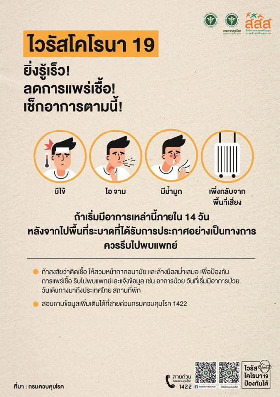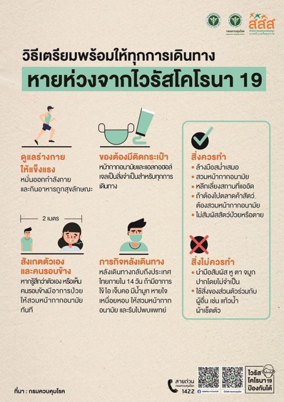 - หลังจากกลับจากต่างประเทศภายใน 14 วัน หากมีอาการป่วยควรรีบไปพบแพทย์โดยเร็ว และแจ้งรายละเอียดว่าเราเคยไปต่างประเทศมาแม้ว่าประเทศนั้นจะไม่มีการติดเชื้อก็ตาม