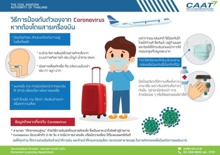 อัพเดท…ทางสำนักงานการบินพลเรือนแห่งประเทศไทย (กพท. หรือ CAAT) ได้คำแนะนำประชาชนที่หากมรเหตุจำเป็นต้องไปต่างประเทศด้วยเครื่องบินในช่วงนี้ โดยทาง กพท. ได้อธิบายและแนะนำวิธีป้องกันตัวเองจากการแพร่ระบาดของเชื้อ ไวรัสโควิด-19 โดยผู้โดยสารควรจำเป็นต้องป้องกันตัวเองในลักษณะเดียวกับการอยู่ในพื้นที่แออัด ดังนี้