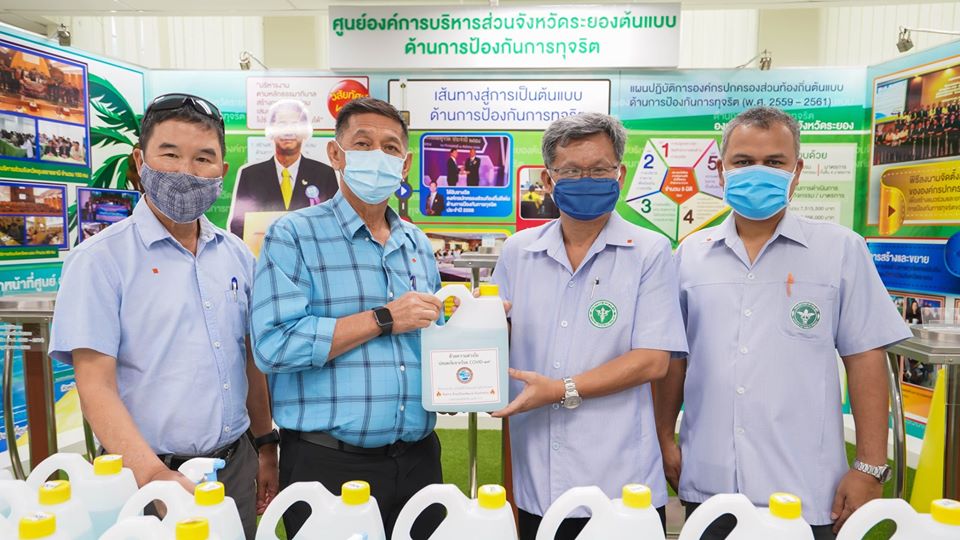 วันที่ 15 พฤษภาคม 2563 เวลา 13.00 น. นายปิยะ ปิตุเตชะ นายกองค์การบริหารส่วนจังหวัดระยอง พร้อมด้วย นายกิตติ เกียรติ์มนตรี รองนายกองค์การบริหารส่วนจังหวัดระยอง (2) นายแพทย์ชัยวัฒน์ จัตตุพร เลขานุการนายก อบจ.ระยอง นายสมศักดิ์ เกตุสาคร รองปลัดอบจ.ระยอง (2) นางจีระกิต อิศรวิชิตชัยกุล หัวหน้าสำนักปลัด ร่วมส่งมอแอลกอฮอล์73% ให้กับนายแพทย์สุนทร เหรียญภูมิการกิจนายแพทย์สาธารณสุขจังหวัดระยอง พร้อมด้วยตัวแทนหน่วยงานสาธารณสุขในจังหวัดระยอง ซึ่งประกอบไปด้วย โรงพยาบาล 8 แห่ง โรงพยาบาลส่งเสริมสุขภาพตำบล 95 แห่ง และหน่วยงานสาธารณสุขต่างๆ จำนวน 200 แกลลอน 800 ฟอกกี้ เพื่อนำไปใช้ป้องกันการติดเชื้อและการแพร่ระบาดของเชื้อไวรัสโคโรนา 2019 (Covid-19) ณ ศูนย์ป้องกันและควบคุมโรคCOVID-19 อบจ.ระยอง