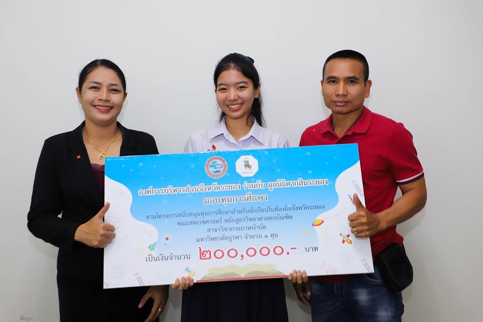 วันที่ 26 มิถุนายน 2563 เวลา 10.00 น. ณ ห้องประชุม 1 ชั้น 8 อบจ.ระยอง องค์การบริหารส่วนจังหวัดระยอง ร่วมกับ มูลนิธิตากสินระยอง มอบทุนการศึกษา ตามโครงการสนับสนุนทุนการศึกษา หลักสูตรวิทยาศาสตรบัณฑิต สาขาวิชากายภาพบำบัด มหาวิทยาลัยบูรพา จำนวน 1 ทุน เป็นจำนวนเงิน 200,000 บาท โดยมี นายปิยะ ปิตุเตชะ นายกองค์การบริหารส่วนจังหวัดระยอง พร้อมคณะผู้บริหาร หัวหน้าส่วนราชการ ผู้อำนวยการกอง และมูลนิธิตากสินระยอง ร่วมมอบทุนการศึกษา ให้กับ นางสาววรีพร ตองติดรัมย์ นักเรียนโรงเรียนเฉลิมพระเกียรติสมเด็จพระศรีนครินทร์ ระยองในพระราชูปถัมภ์สมเด็จพระเทพรัตนราชสุดาฯ สยามบรมราชกุมารี ซึ่งได้สมัครเข้าร่วมโครงการและผ่านการตรวจสอบคุณสมบัติครบถ้วนจนสามารถได้สิทธิรับทุนหลักสูตรวิทยาศาสตรบัณฑิต สาขาวิชากายภาพบำบัด มหาวิทยาลัยบูรพา ตลอดหลักสูตร 4 ปี โดยในอนาคตองค์การบริหารส่วนจังหวัดระยอง จะจัดตั้งศูนย์บริการสุขภาพ ฟื้นฟู และดูแลผู้สูงอายุจังหวัดระยอง ซึ่งโครงการนี้ก็เป็นส่วนหนึ่งในการเตรียมความพร้อมทางด้านบุคลากรสาขาวิชากายภาพบำบัดซึ่งจะกลับมาปฏิบัติเพื่อสร้างประโยชน์ให้กับจังหวัดระยองต่อไป