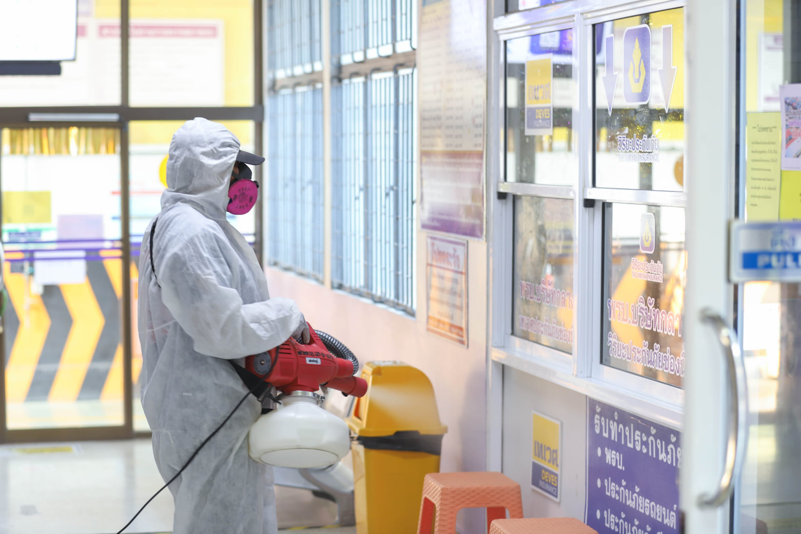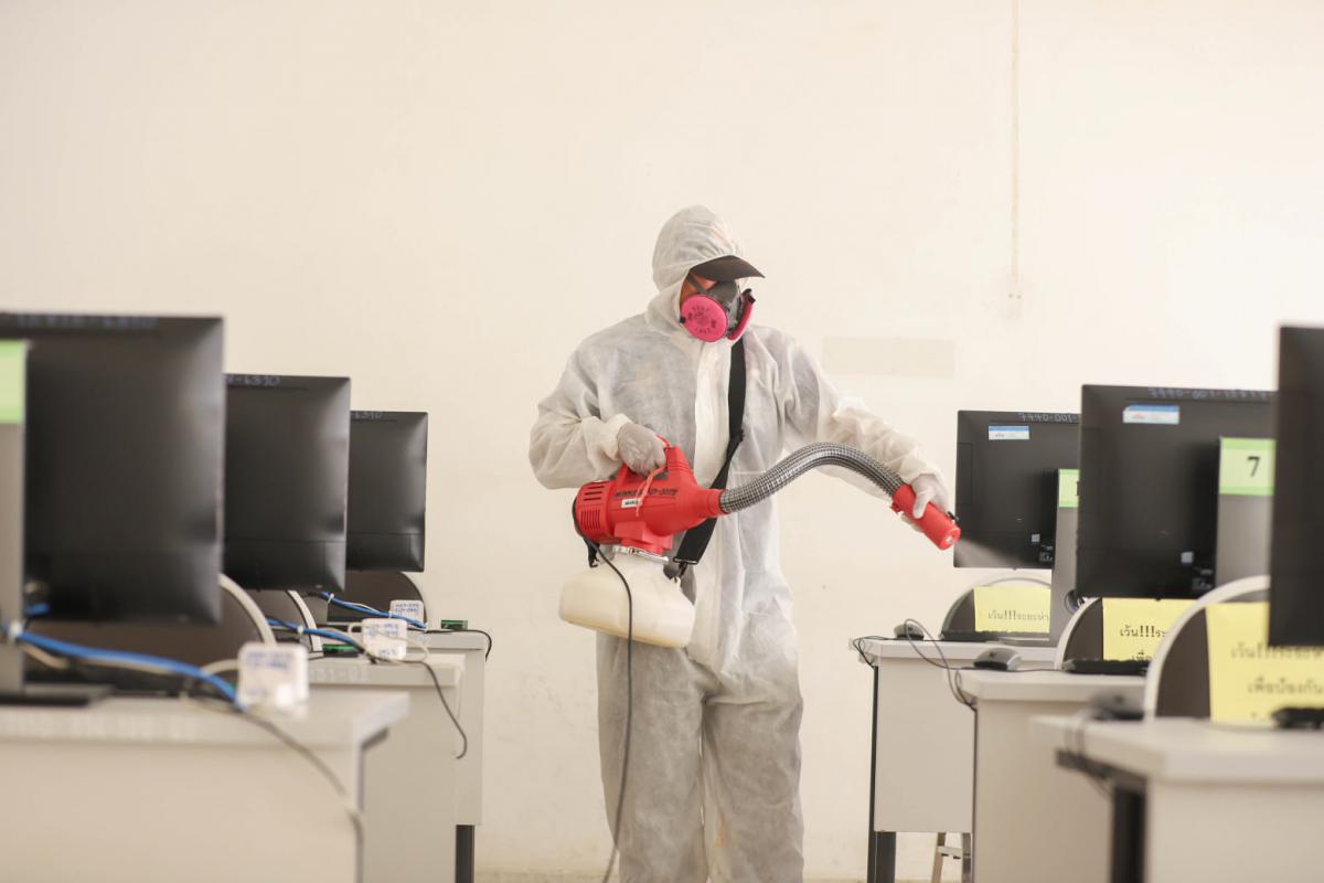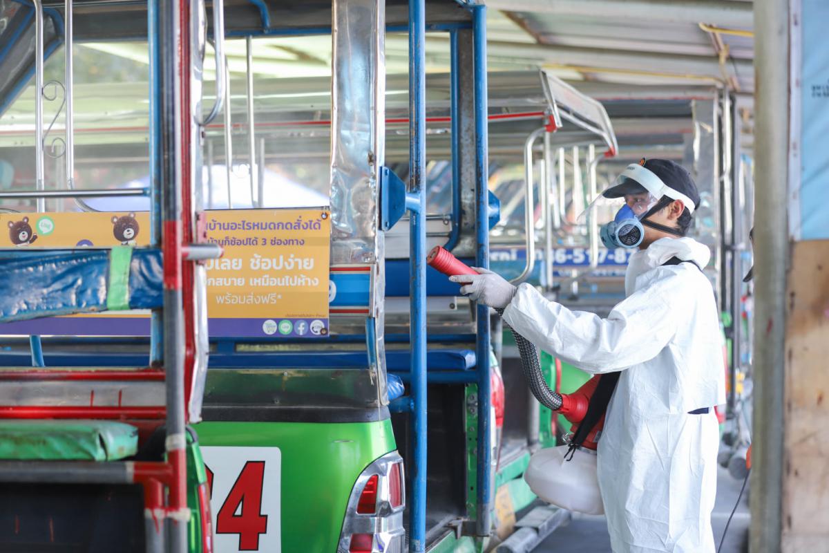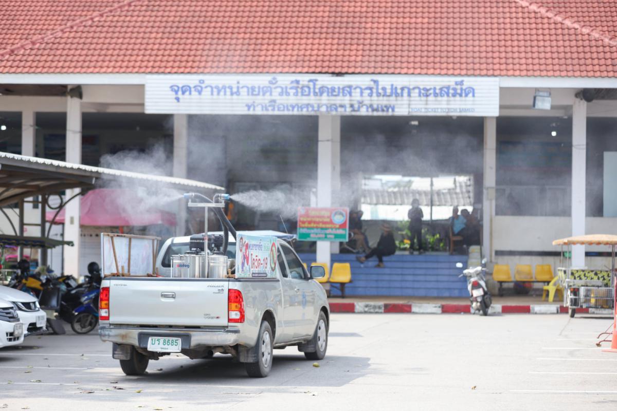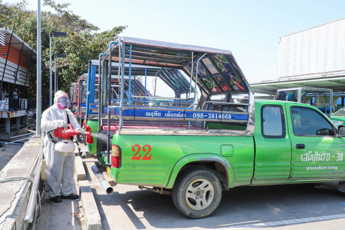 องค์การบริหารส่วนจังหวัดระยอง นำเจ้าหน้าที่ทำการฉีดพ่นน้ำยาฆ่าเชื้อ บริเวณสถานที่ที่มีความเสี่ยงต่อเชื้อไวรัส Covid-19