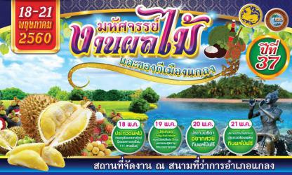 จัดขึ้นเป็นปีที่ 37 ที่บริเวณที่ว่าการอำเภอแกลง ซึ่งจะจัดขึ้นระหว่างวันที่ 18-21 พ.ค.นี้ โดยภายในงานจะมีการนำผลผลิตทางการเกษตรขึ้นชื่อของอำเภอ เช่น ทุเรียน เงาะ สละ ลองกอง และมังคุด ที่ปลูกโดยเกษตรกรในพื้นที่ออกจำหน่าย เพื่อให้ผู้บริโภคได้พบกับผู้ผลิตชาวสวนโดยตรง ได้รับประทานผลไม้ชั้นเลิศในราคาชาวสวนด้วย นอกจากนี้ภายในงานยังมีการเชิญชวนให้นักท่องเที่ยว เข้าเที่ยวชมสวนผลไม้ในพื้นที่ โดยเปิดเป็นท่องเที่ยวแบบเชิงเกษตร จำนวน 5 แห่ง และเชิญชวนชิมทุเรียนเผา ที่ทำขึ้นเป็นแห่งแรกของจังหวัดระยอง โดยนำทุเรียนพันธุ์หมอนทอง และพันธุ์ชะนีที่แก่จัดแต่ยังไม่สุก นำมาใส่เตาเผา รวมทั้งในพิธีเปิดงานยังได้จัดให้มีขบวนรถสามล้อตกแต่งด้วยผลไม้ เปิดถนนผลไม้ การประกวด Young fruit Model การแข่งขันการโยนและรับทุเรียน ประกวดแฟนพันธุ์แท้การดูทุเรียนคุณภาพและทุเรียนอ่อน ประกวดตำน้ำพริกกะปิ การตำส้มตำทุเรียน และการประกวดธิดาอยากสวยอีกด้วย