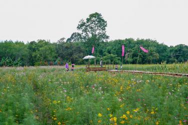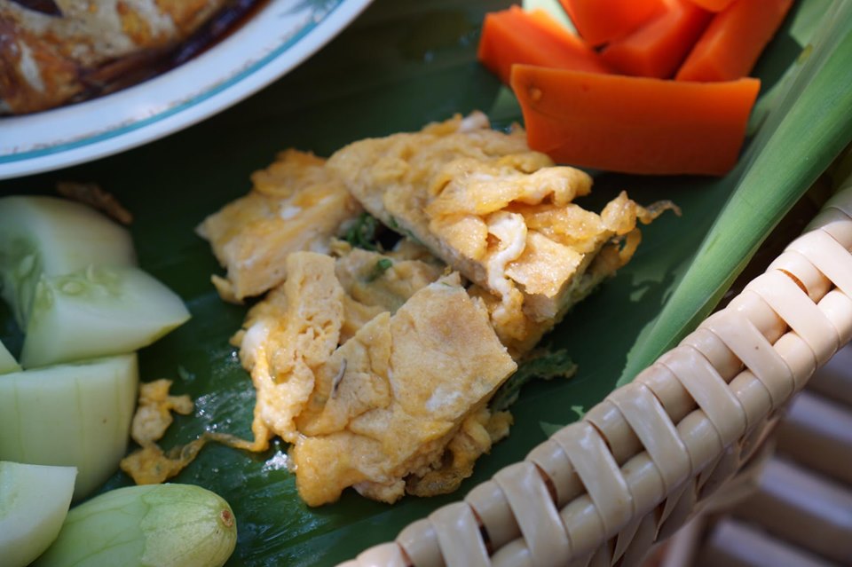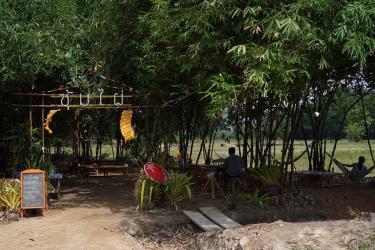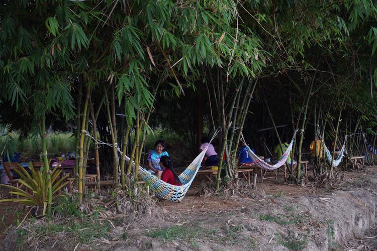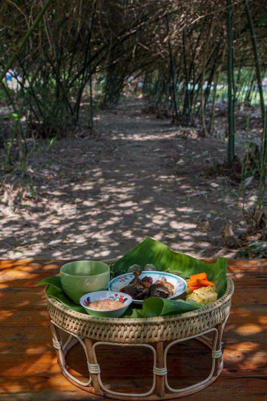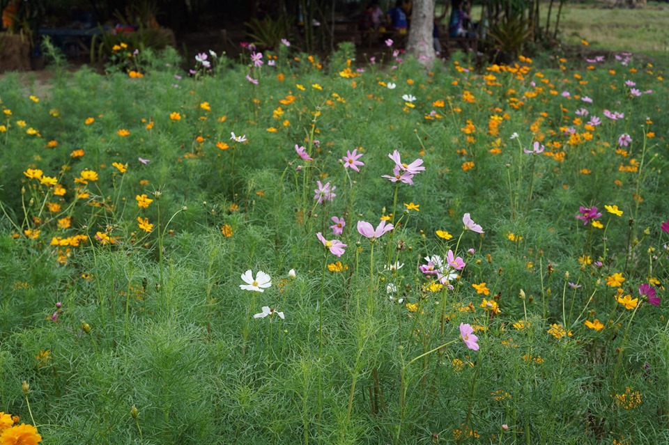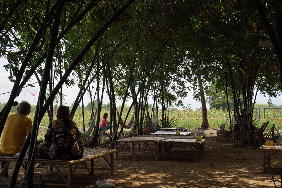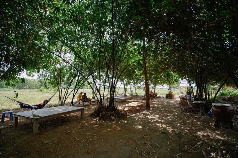อากาศร้อนมาหลบร้อนใต้ซุ้มไผ่ ลมโชยไม่ร้อนมีเปลให้ผูกนอนเย็นสบาย พร้อมอาหารพื้นบ้านและขันโตกอาหารถิ่นระยองอย่างปลาต้มหวานกับชุดน้ำพริกระกำ ด้านข้างมีทุ่งคอสมอสเล็กๆ ให้ได้ถ่ายรูปกันด้วย