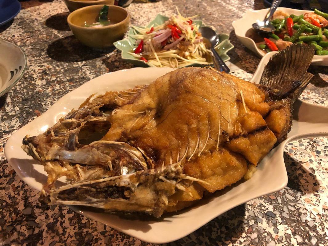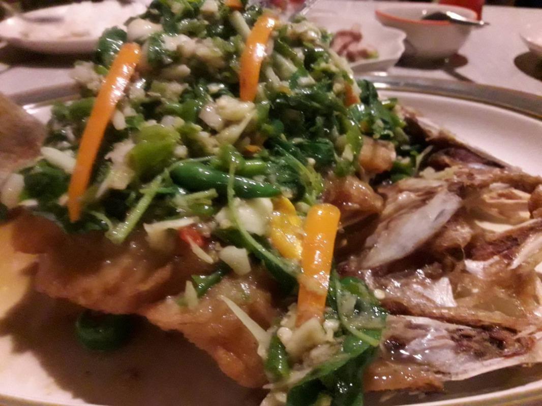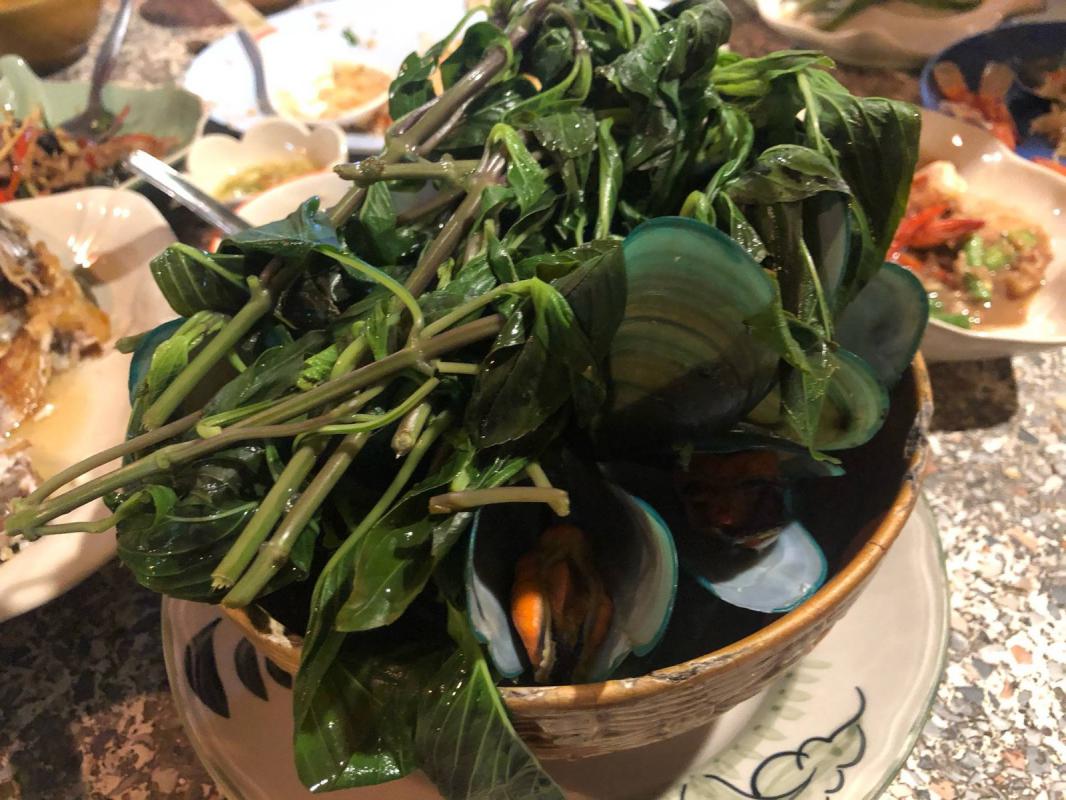 หอยแมลงภู่ มีใบโหระพาโปะมาด้วย น้ำจิ้มรสเด็ด ปลากระพงทอดน้ำปลา ต้มยำรวมมิตร จัดจ้าน จี๊ดจ๊าด