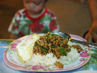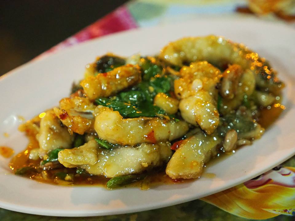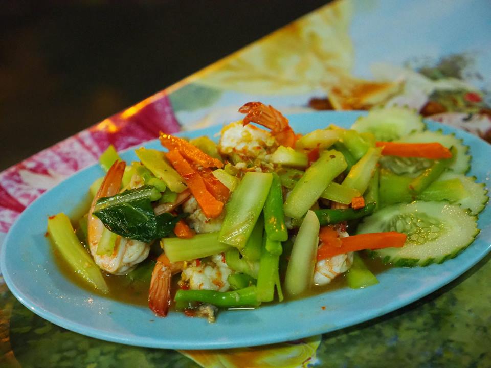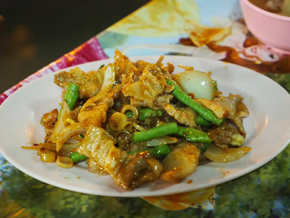 อาหารตามสั่งปิดดึก ชื่อเมนูดูเหมือนจะเหมือนร้านทั่วไป แต่สูตรนี่ไม่เหมือนกันเลย อย่างปลาผัดพริกสามรส จะเป็นปลาชิ้นทอด ผัดกับพริกและใบกะเพราพร้อมด้วยผักกาดดอง กุ้งคลุกพริกเกลือก็จะเป็นการเอากุ้งไปผัดกับคะน้าแต่ยังมีรสชาติความเป็นพริกเกลืออยู่ หมูผัดกะปิก็ใส่ตะไคร้มาด้วย รสชาติโดยรวมกลางๆ ไม่ถึงขั้นเผ็ดดุ อาหารก็จะมีราคาตั้งแต่ 60, 70, 80 ส่วนราดข้าวแบบจานเดียวเริ่มต้น 40฿ มีน้ำซุปให้เติมฟรีอีกด้วยครับ ร้านอยู่ริมถนนสุขุมวิท มาจากเทศบันเทิง เลยสามแยก ผ่าน 7-eleven ให้เตรียมชิดซ้ายร้านอยู่หน้าร่วมเจริญอลูมิเนียมครับ