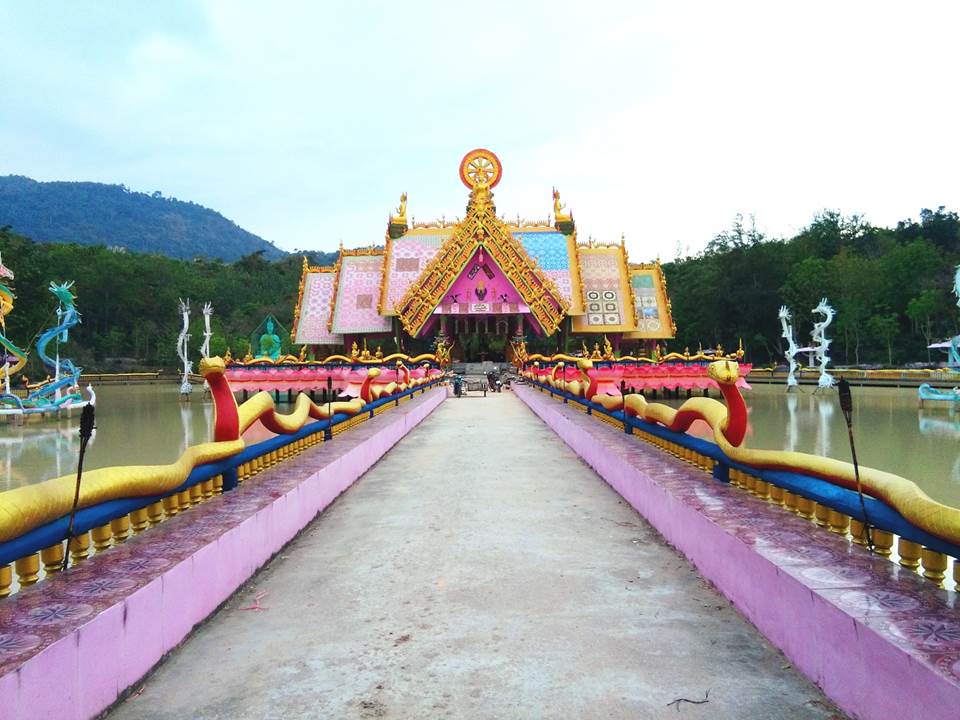 เราไปดูอีกฝั่งของถนนกันบ้าง เมื่อเดินมาที่ฝั่งซ้าย จะมีศาลากลางน้ำสีสันสวยงามสะดุดตามาก เป็นศาลาสีชมพู