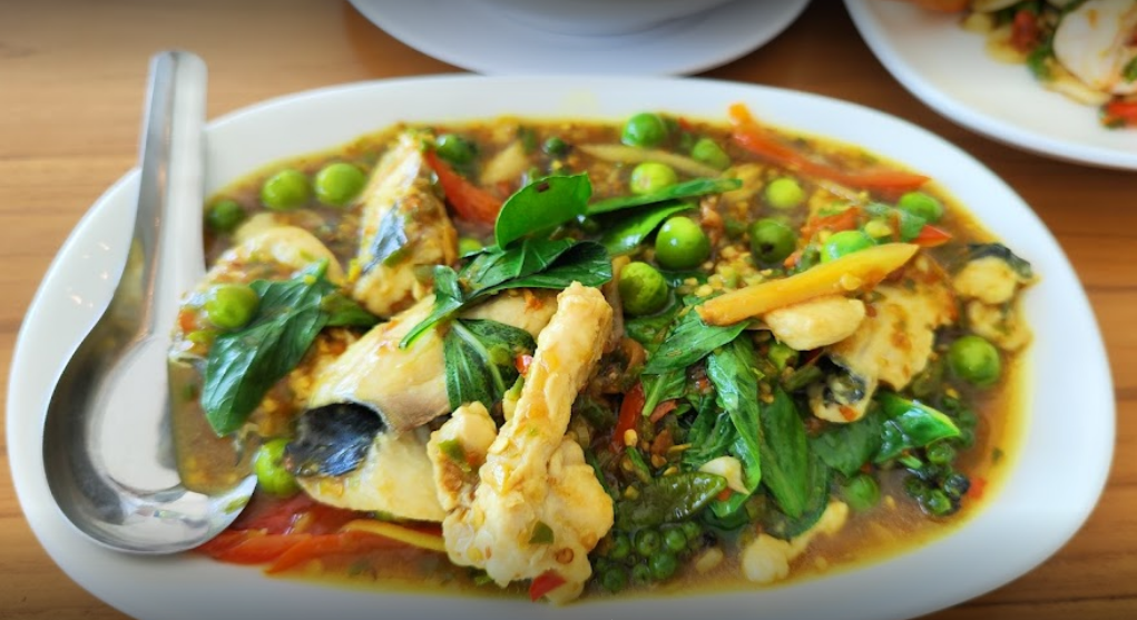 ปลากระพงโบราณ เนื้อปลาสด ราดด้วยน้ำปลาโรยด้วยเม็ดมะม่วง รสชาติคือลงตัวเลยค่ะ