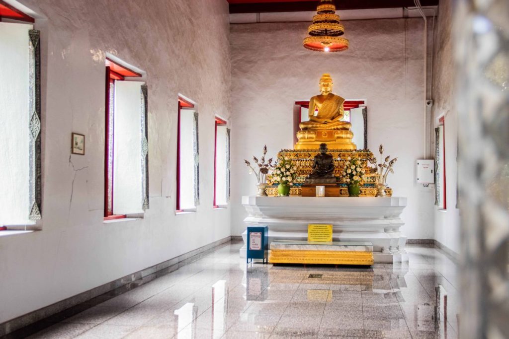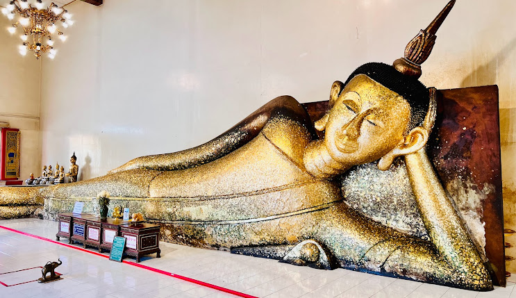 แวะสักการะพระพุทธรูปปางปาลิไลยก์ประทับอยู่ในท่านั่งหอยพระบาทองค์เก่าแก่ที่อยู่คู่กับวัดเพื่อเสริมสิริมงคล
