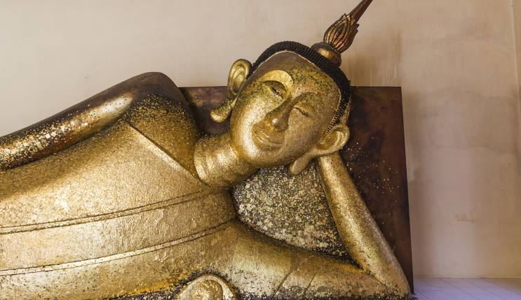 อื่น ๆ ตรงที่ประทับอยู่ในท่านอนตะแคงซ้าย และเดิมทีเดียวพระพุทธรูปองค์นี้ประดิษฐานกลางแจ้ง และภายหลังได้มีการ