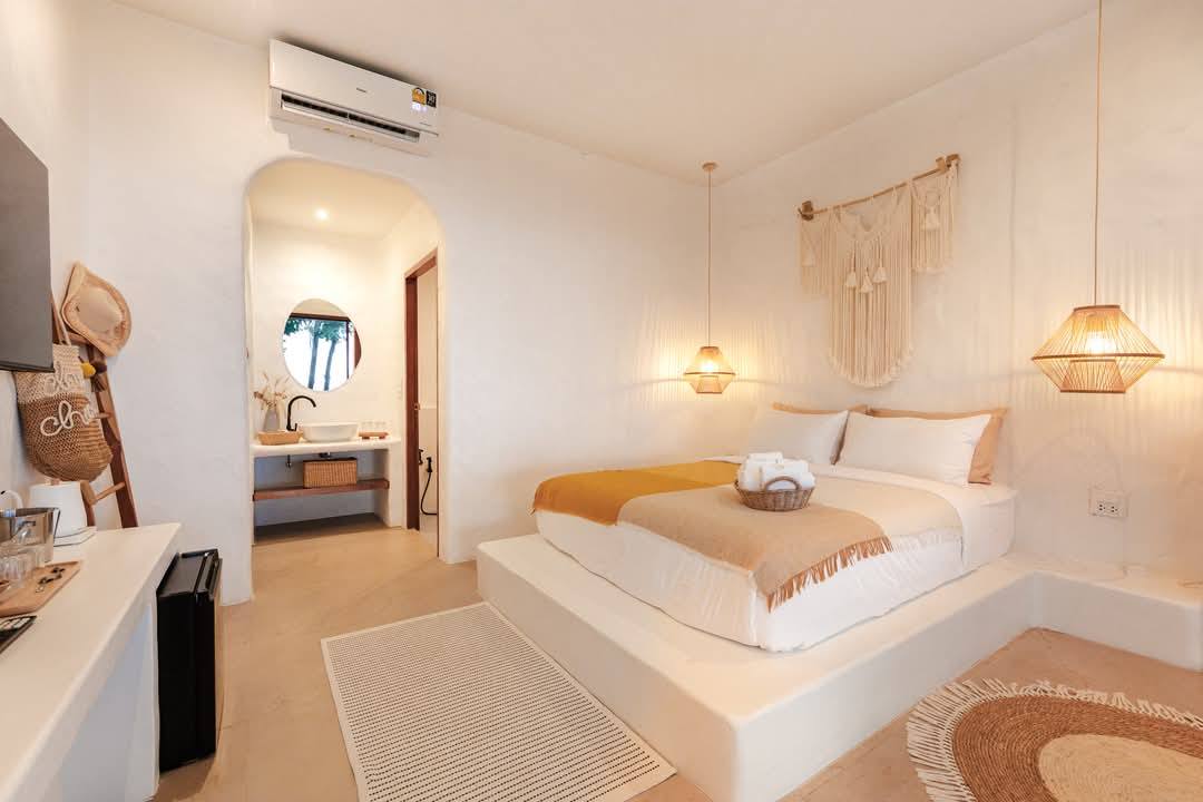 ลมหนาวพัดมาเย็นสบายสุดๆ จะนอนฟังเสียงคลื่น ชมวิวทะเลก็แสนจะชิล โดยตัวที่พักจะตกแต่งด้วยสีขาวสไตล์มินิมอล