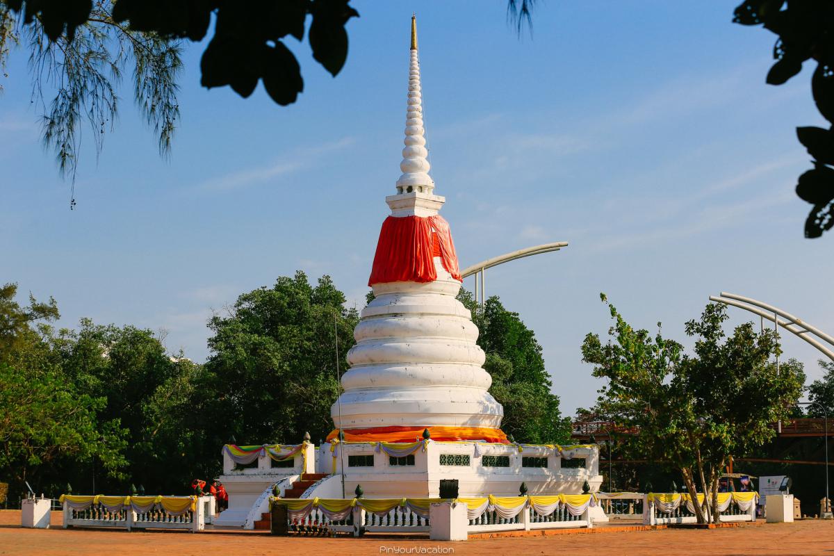 สูง 10 เมตร ตั้งอยู่บนเกาะกลางแม่น้ำระยองเลยค่ะ และมีสะพานไว้เดินเข้าไปชมตัวเจดีย์ จริงๆ แล้ว