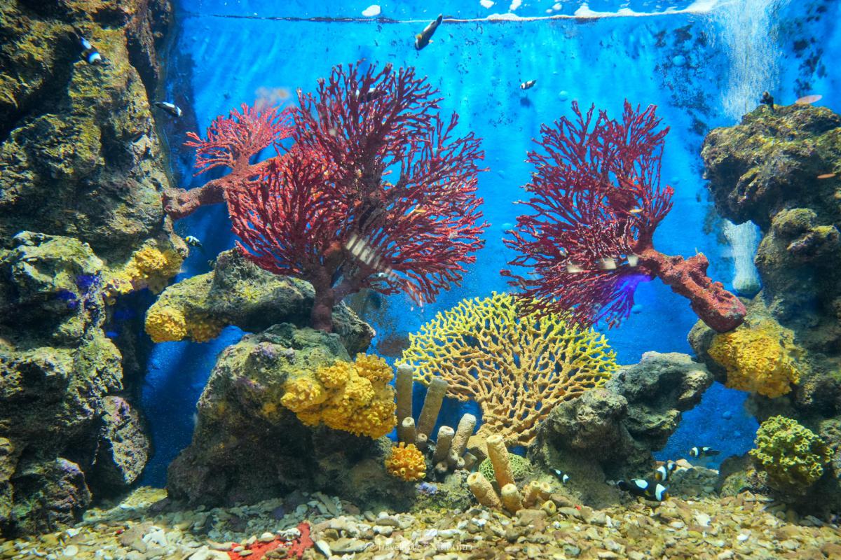 ทั้งสวยงามและหายาก โดยแบ่งออกเป็นส่วนต่างๆ ก็คือ บ่อจัดแสดงระบบนิเวศน์น้ำตื้น ไม่ว่าจะเป็น ปลาดาว