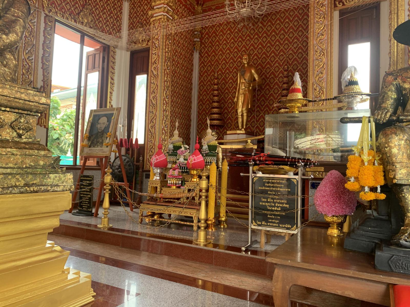 ประกอบกับลายกนกสีทองที่ตกแต่งไว้โดยรอบ นอกจากจะมีพระบรมรูปอยู่ภายในแล้ว ก็ยังมีทั้งหมวกและ