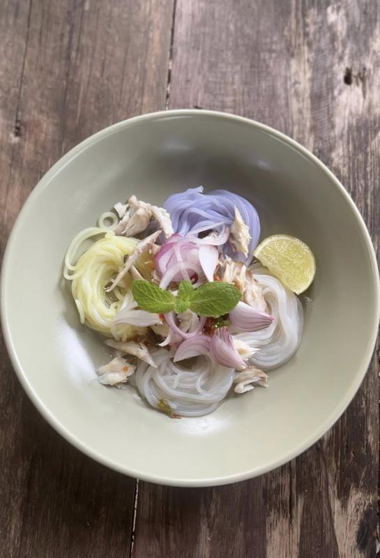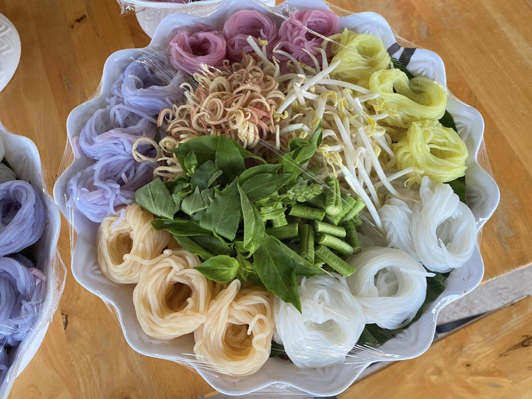 เป็นขนมจีนเส้นสด หลากสีสันสัน ทั้งเหลืองขมิ้น ม่วงอัญชัน